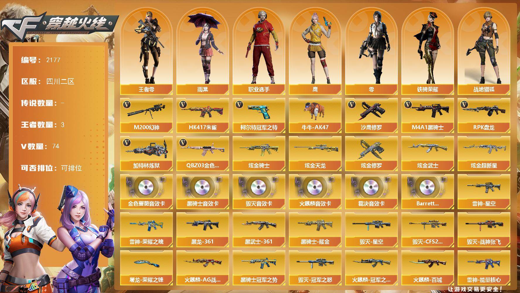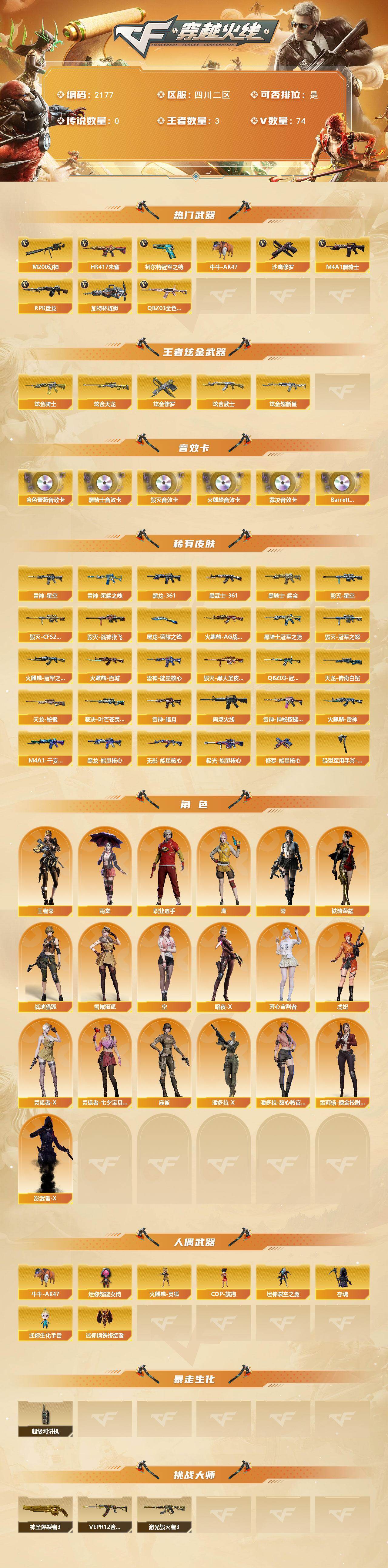 [16948545]四川二区-77V-3王者武器数-5炫金武器数 【热门武器】:QBZ03-金色蔷薇,HK417-朱雀,M200-幻神,柯尔特-冠军之特*2,牛牛-AK47,M4A1-黑骑士,RPK-盘龙,加特林-炼狱,沙鹰-修罗 【王者炫金武器】:炫金骑士,炫金武士,炫金超新星,炫金天龙,炫金修罗 【音效卡】:AK47-火麒麟音效卡,M4A1-黑骑士音效卡,Barrett-毁灭音效卡,QBZ03-金色蔷薇音效卡,AWM-裁决音效卡,Barrett-碧霄极光音效卡 【皮肤】:QBZ03-冠军之薇,裁决-叶芒苍灵 皮肤,雷神-暗月,雷神-能量核心,雷神-荣耀之魄,雷神-星空,M4A1-再燃火线,雷神-神秘按键 皮肤,火麒麟-AG战队皮肤,火麒麟-雷神,火麒麟-冠军之心,火麒麟-百城,毁灭-星空,毁灭-冠军之怒,毁灭-CFS2020,毁灭-战神张飞,毁灭-黑大圣皮肤,M4A1-千变-孔明皮肤,黑龙-能量核心,M4A1-黑龙-361,黑骑士耀金皮肤,黑骑士-冠军之势,无影-能量核心,AK47-黑武士-361,天龙-秘银,AWM-天龙-传奇白鲨,极光-能量核心,修罗-能量核心,屠龙-荣耀之锋,轻型军用手斧-再燃火线 【角色】:零,雨棠,鹰,战地猎狐,王者-零,雪域霜狐,空,暗夜-X,芳心审判者,虎妞,灵狐者-X,灵狐者-七夕宝贝,麻雀,潘多拉-X,潘多拉-甜心教官,铁骑荣耀,雪莉杨-摸金校尉,影武者-X,职业选手 【人偶武器】:火麒麟-灵狐,迷你钢铁终结者,COP-旗袍,牛牛-AK47,迷你裂空之翼*5,夺魂,迷你生化手雷,迷你超能女侍 【暴走生化】:超级对讲机 【挑战大师】:神圣爆裂者III,VEPR-12-金魔,激光毁灭者III 【英雄级武器】:AK47-火麒麟,M4A1-黑龙,M4A1-雷神*2,M4A1-黑骑士,AK47-无影,AK47-黑武士,AK47-黑鲨,M4A1-龙血*3,HK417-朱雀,SCAR Light-玄豹,M4A1-玫瑰精灵,QBZ03-金色蔷薇,王者之魄-觉醒版,超新星-悦享-觉醒版,Barrett-毁灭,Barrett-极光,AWM-裁决,M200-幻神,Barrett-朱雀,王者星神-觉醒版,RPK-盘龙,加特林-炼狱,AA-12-雷霆,沙鹰-修罗,沙鹰-天神*2,柯尔特-冠军之特*2,柯尔特-电竞装甲*3,Anaconda-玄豹,屠龙*2,龙啸*2,擎天,