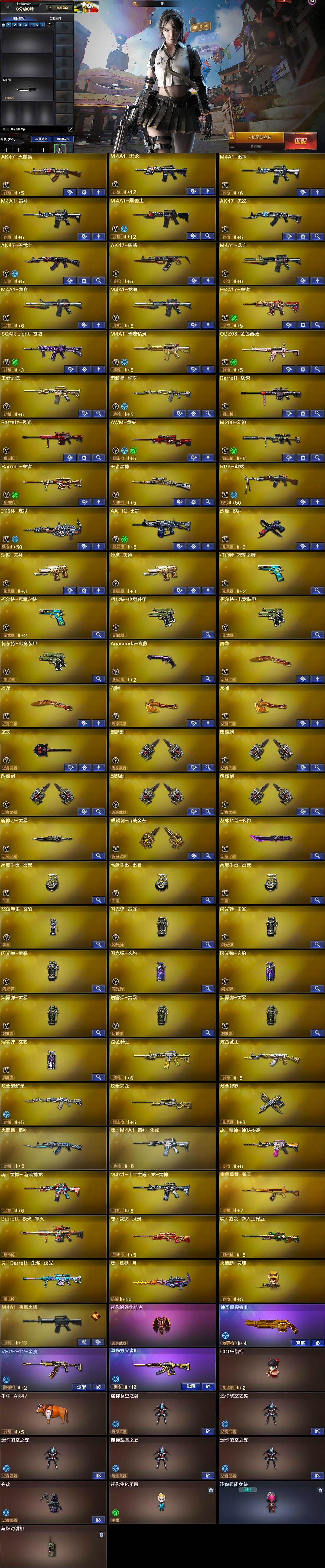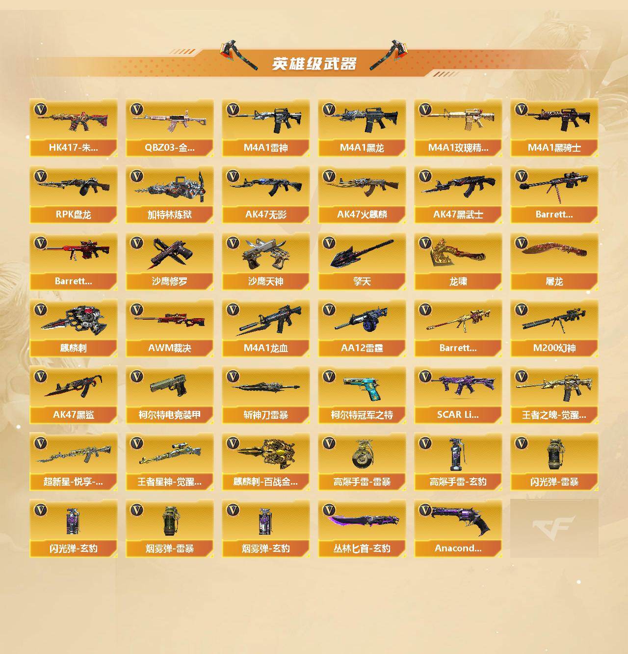 【英雄级武器】:AK47-火麒麟,M4A1-黑龙,M4A1-雷神*2,M4A1-黑骑士,AK47-无影,AK47-黑武士,AK47-黑鲨,M4A1-龙血*3,HK417-朱雀,SCAR Light-玄豹,M4A1-玫瑰精灵,QBZ03-金色蔷薇,王者之魄-觉醒版,超新星-悦享-觉醒版,Barrett-毁灭,Barrett-极光,AWM-裁决,M200-幻神,Barrett-朱雀,王者星神-觉醒版,RPK-盘龙,加特林-炼狱,AA-12-雷霆,沙鹰-修罗,沙鹰-天神*2,柯尔特-冠军之特*2,柯尔特-电竞装甲*3,Anaconda-玄豹,屠龙*2,龙啸*2,擎天,