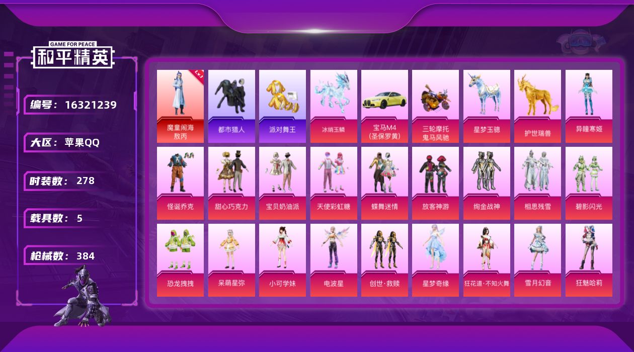 [16321239]苹果 手Q-1神装-20粉装-16特效枪-5载具-8粉色飞行器-131146热力值-18王牌印记-278套装-384枪皮