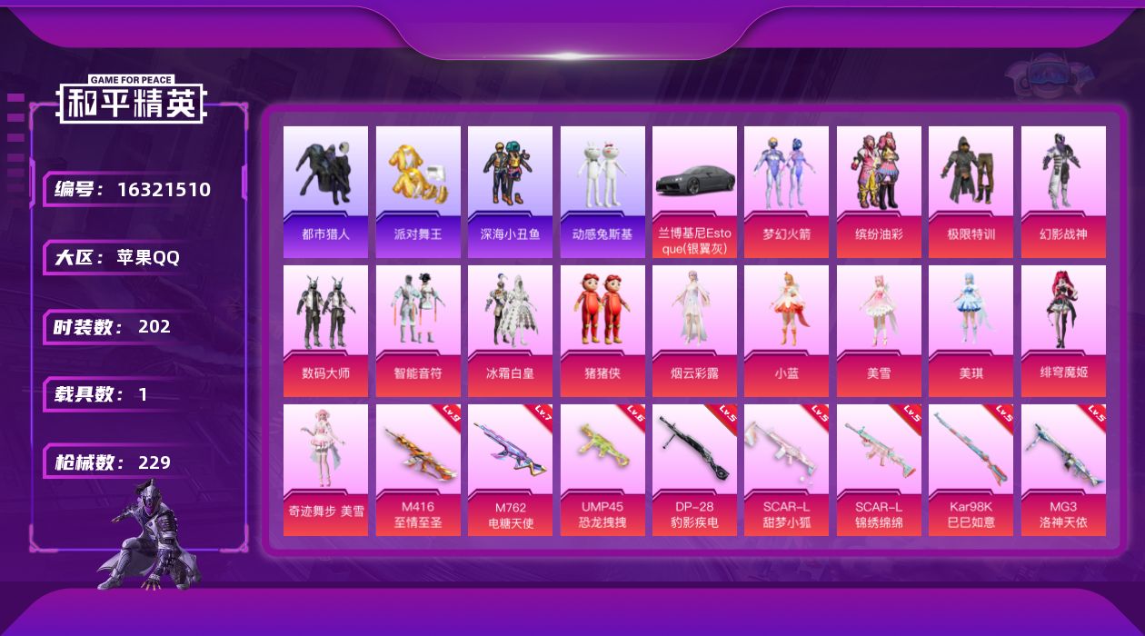 [16321510]苹果 手Q-无敌战神框-14粉装-8特效枪-1载具-3粉色飞行器-82815热力值-13王牌印记-202套装-229枪皮 【热门品类】:粉装-梦幻火箭,粉装-缤纷油彩,套装-浪漫天命,套装-都市猎人,套装-派对舞王,套装-深海小丑鱼,套装-忍者信条,套装-动感兔斯基人偶服,套装-龟仙人,套装-暗影哥特,套装-粉红小猪 【粉色载具】:兰博基尼Estoque(银翼灰),僚机-萌兔起飞 【粉色套装】:粉装-极限特训,粉装-幻影战神,粉装-数码大师,粉装-梦幻火箭,粉装-智能音符,粉装-缤纷油彩,粉装-冰霜白皇,玩偶服-猪猪侠,角色-烟云彩露,角色-小蓝,角色-美雪,角色-美琪,角色-绯穹魔姬,角色-奇迹舞步 美雪 【粉色枪皮等级】:SCAR-L-甜梦小狐(五级),SCAR-L-锦绣绵绵(五级),M416-至情至圣(九级),M762-电糖天使(七级),UMP45-恐龙拽拽(六级),Kar98K-巳巳如意(五级),DP-28-豹影疾电(五级),MG3-洛神天依(五级) 【粉色枪皮】:SCAR-L-甜梦小狐,SCAR-L-锦绣绵绵,M416-至情至圣,M762-电糖天使,UMP45-恐龙拽拽,Kar98K-巳巳如意,DP-28-豹影疾电,MG3-洛神天依 【粉色飞行器】:梦幻火箭飞行器,天之羽翼飞行器,镜域双华-灵镜之阶 【粉色降落伞】:极限特训降落伞,幻影战神降落伞,甜心宝贝降落伞,梦幻火箭降落伞,洛神天依降落伞,恐龙拽拽降落伞,甜梦小狐降落伞,垂柳戏鸭降落伞,圣堂之誓降落伞,猪猪侠降落伞,镜域双华降落伞,绝色倾城降落伞,江南烟雨降落伞,千金淑猫降落伞,异瞳寒姬降落伞 【稀有套装】:套装-龟仙人,套装-雏菊兔兔,套装-萝兰蝴蝶,套装-小熊娃娃,角色-绛羽幽主,套装-朱霞炽焰,套装-凌霄紫焰,角色-绯色魅影 【稀有枪皮】:AKM-夜灯,AKM-彩虹符号,AKM-影袭,AKM-恐龙拽拽,AKM-星之彼岸,AKM-江南烟雨,AKM-灼热熔岩,AKM-虎虎生威,AKM-龙的传人,M16A4-幻世战舞者,M16A4-甜心亚梦,SCAR-L-暗夜玫瑰,SCAR-L-炫彩节奏,SCAR-L-玉兔迎春,SCAR-L-银河战甲,M416-夜灯,M416-糯团青竹,M416-紫翼圣骑,M416-绯红前夜,GROZA-异彩先驱,GROZA-影袭,GROZA-恐龙拽拽,GROZA-懵萌河马,AUG