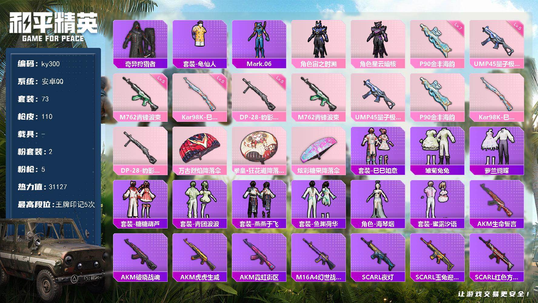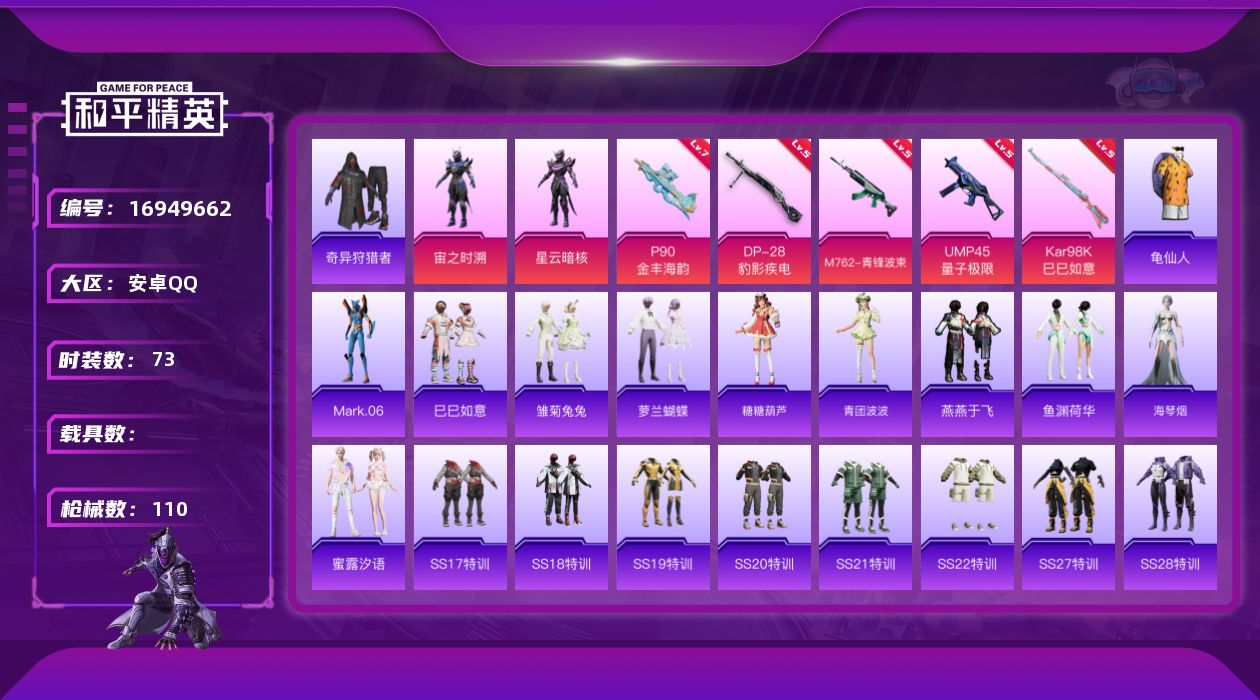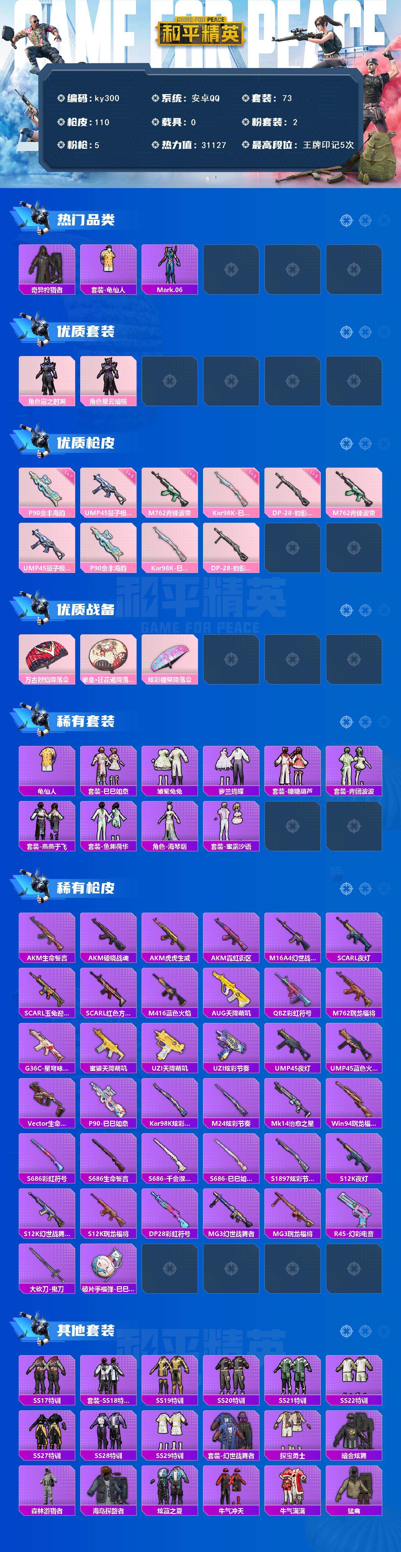 [16949662]安卓 手Q-2粉装-5特效枪-0载具-0粉色飞行器-31127热力值-5王牌印记-73套装-110枪皮 【热门品类】:套装-奇异狩猎者,套装-龟仙人,角色-Mark.06 【粉色套装】:角色-宙之时溯,角色-星云暗核 【粉色枪皮等级】:M762-青锋波束(五级),UMP45-量子极限(五级),P90-金丰海韵(七级),Kar98K-巳巳如意(五级),DP-28-豹影疾电(五级) 【粉色枪皮】:M762-青锋波束,UMP45-量子极限,P90-金丰海韵,Kar98K-巳巳如意,DP-28-豹影疾电 【粉色降落伞】:万古烈焰降落伞,拳皇·狂花道降落伞,炫彩糖果降落伞 【稀有套装】:套装-龟仙人,套装-巳巳如意,套装-雏菊兔兔,套装-萝兰蝴蝶,套装-糖糖葫芦,套装-青团波波,套装-燕燕于飞,套装-鱼渊荷华,角色-海琴烟,套装-蜜露汐语 【稀有枪皮】:AKM-生命誓言,AKM-破晓战魂,AKM-虎虎生威,AKM-霓虹街区,M16A4-幻世战舞者,SCAR-L-夜灯,SCAR-L-玉兔迎春,SCAR-L-红色方程式,M416-蓝色火焰,AUG-天降萌叽,QBZ-彩虹符号,M762-瑞龙福将,G36C-星穹咏叹调,蜜獾-天降萌叽,UZI-天降萌叽,UZI-炫彩节奏,UMP45-夜灯,UMP45-蓝色火焰,Vector-生命誓言,P90-巳巳如意,Kar98K-炫彩节奏,M24-炫彩节奏,Mk14-治愈之星,Win94-瑞龙福将,S686-彩虹符号,S686-生命誓言,S686-巳巳如意,S686-千金淑猫,S1897-炫彩节奏,S12K-瑞龙福将,S12K-夜灯,S12K-幻世战舞者,DP-28-彩虹符号,MG3-幻世战舞者,MG3-瑞龙福将,R45-幻彩电音,大砍刀-鬼刀,破片手榴弹-巳巳如意 【其他套装】:套装-SS17特训,套装-SS18特训,套装-SS19特训,套装-SS20特训,套装-SS21特训,套装-SS22特训,套装-SS27特训,套装-SS28特训,套装-SS29特训,套装-幻世战舞者,套装-探宝勇士,套装-暗金炫舞,套装-森林游猎者,套装-海岛探路者,套装-炫蓝之夏,套装-牛气冲天,套装-牛气满满,套装-猛禽,套装-玉兔迎春,套装-空投萌叽,套装-竞技名士,套装-缤纷果语,套装-耀眼新星,套装-蓝色运动,套装-虎虎生威吉莉,套装-都市漫游者,套装-长空猛禽