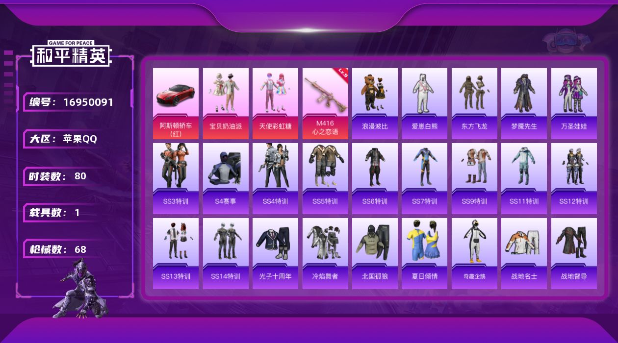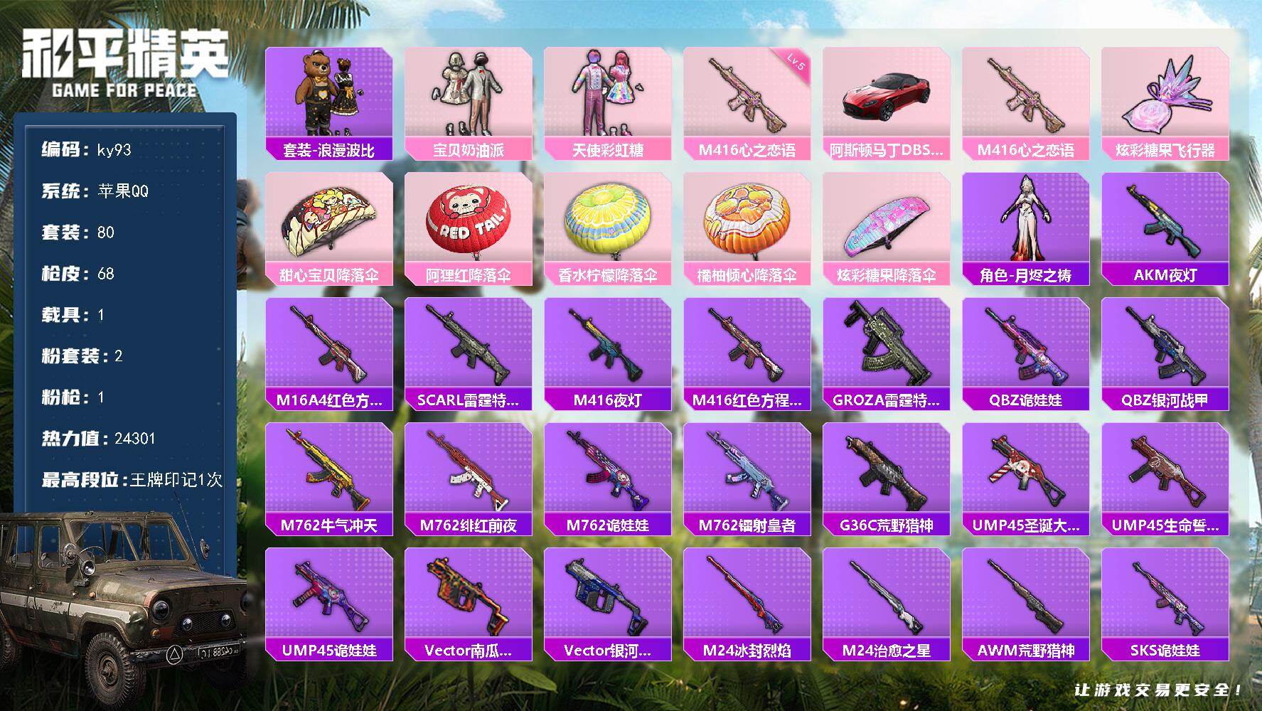 [16950091]苹果 手Q-2粉装-1特效枪-1载具-1粉色飞行器-24301热力值-1王牌印记-80套装-68枪皮