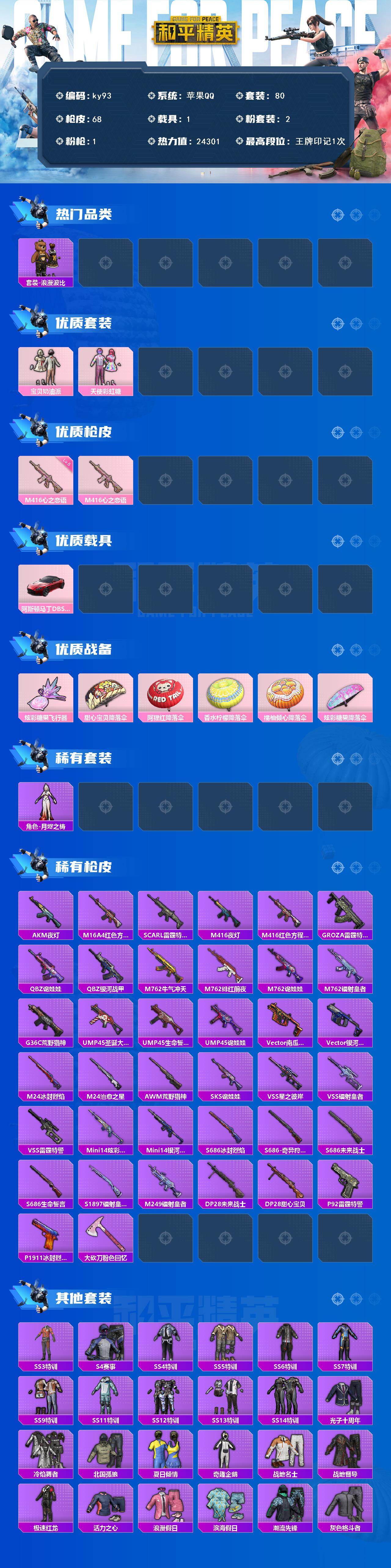 - [15611740]身法素材号【特价急出/详情看图】:苹果 手Q-2神装-2粉装-5特效枪-3载具-3粉色飞行器-51690热力值-3王牌印记-104套装-138枪皮 【红色神装等级】:最终圣卫者-帕修斯(二级),辉羽雀灵-初翊(一级) 【红色角色神装】:最终圣卫者-帕修斯,辉羽雀灵-初翊 【热门品类】:套装-龟仙人 【粉色载具】:玛莎拉蒂Ghibli(粉),迈凯伦塞纳(冷萃蓝),辉羽雀灵自行车 【粉色套装】:粉装-金曜白虎,粉装-星穹咏叹调 【粉色枪皮等级】:M416-心之恋语(七级),Vector-最终圣卫者(三级),Kar98K-巳巳如意(五级),DP-28-豹影疾电(五级),MG3-辉羽雀灵(三级) 【粉色枪皮】:M416-心之恋语,Vector-最终圣卫者,Kar98K-巳巳如意,DP-28-豹影疾电,MG3-辉羽雀灵 【粉色飞行器】:雀灵庇佑飞行器,幻星舰长飞行器,终晖之翼飞行器 【粉色降落伞】:银河战甲降落伞,春暖花开降落伞,香水柠檬降落伞,洛神天依降落伞,精灵梦叶罗丽降落伞,创世·救赎降落伞,临安公主降落伞,星穹咏叹调降落伞,辉羽雀灵降落伞,湮灭星辰降落伞,幻星舰长降落伞,最终圣卫者降落伞 【稀有套装】:套装-龟仙人,套装-雏菊兔兔,套装-萝兰蝴蝶,套装-小熊娃娃,角色-都市丽猫,套装-紫幽梦,套装-蓝冰羽,套装-星渊小夜曲,套装-虚空漩涡,套装-极速光影,角色-乐音 【稀有枪皮】:AKM-冰凉西瓜,AKM-春暖花开,AKM-破晓战魂,AKM-萌趣颜团子,AKM-虎虎生威,M16A4-红色方程式,M16A4-最终圣卫者,SCAR-L-炫彩节奏,SCAR-L-红色方程式,M416-仓鼠灰灰,M416-糯团青竹,M416-蓝色火焰,GROZA-恐龙拽拽,GROZA-春暖花开,AUG-耀粉歌者,M762-快乐主宰,M762-拳皇97,G36C-星穹咏叹调,蜜獾-天降萌叽,Famas-湮灭星辰,UZI-幻影战神,UZI-炫彩节奏,UZI-月影灵韵,UMP45-春暖花开,Vector-焰鹰斗篷,Vector-生命誓言,汤姆逊-天降萌叽,汤姆逊-耀粉歌者,汤姆逊-幻星舰长,野牛-最终圣卫者,AKS-74U-辉羽雀灵,P90-巳巳如意,Kar98K-彩虹符号,Kar98K-炫彩节奏,Kar98K-狮舞迎春,Kar98K-王子的夏天,Kar98k-最终圣卫者,M24-冰封烈焰,M2