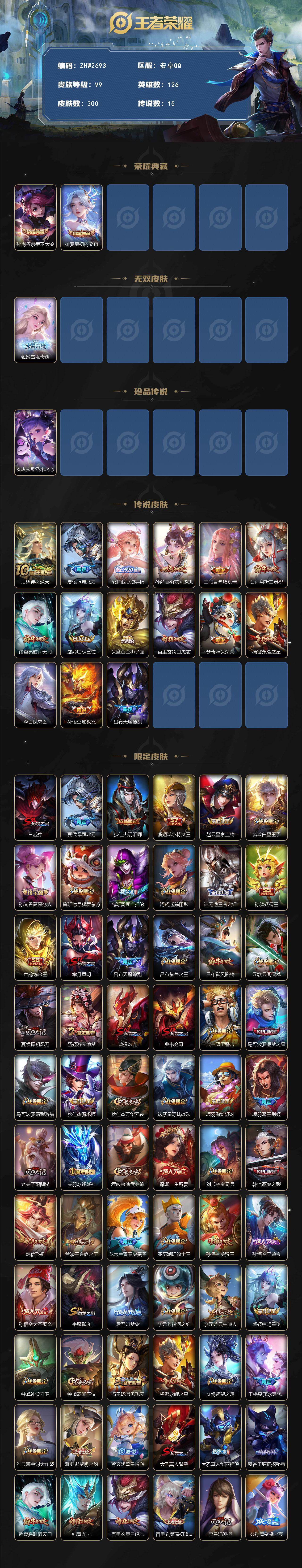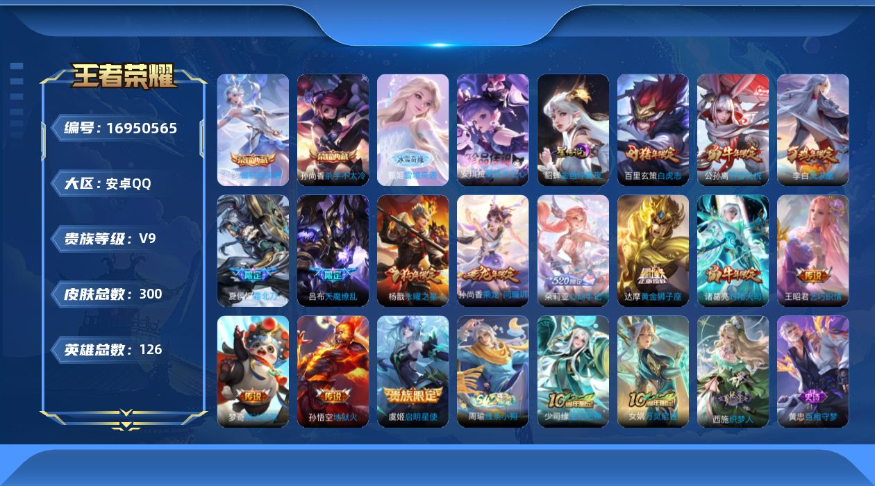 [16950565]安卓Q-V9-至尊星耀II段位-126英雄-300皮肤-2典藏皮肤-1无双-1珍品传说-15传说-79史诗