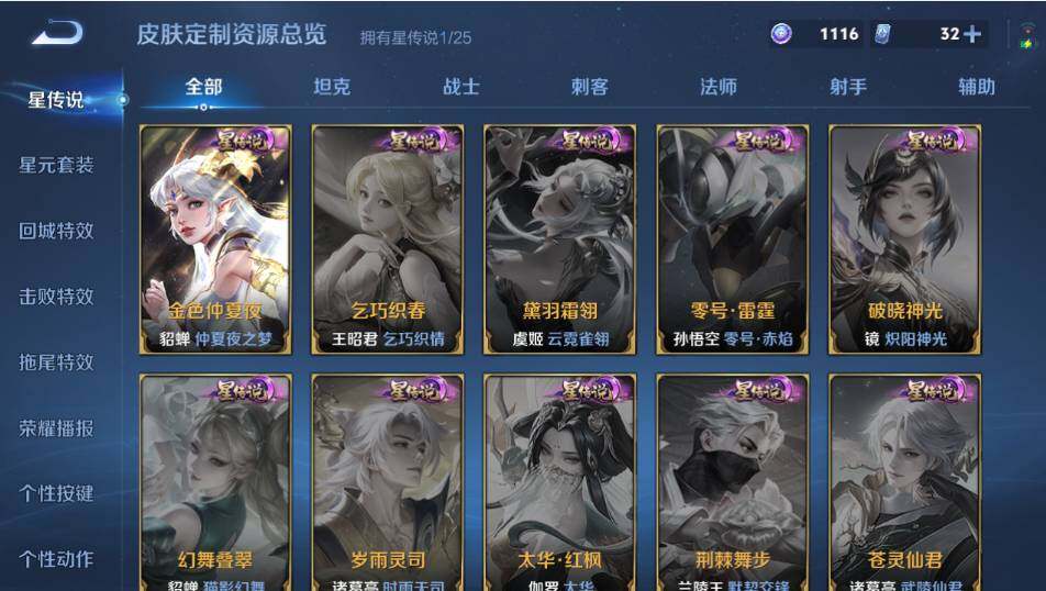 孙膑妖精王,扁鹊炼金王,虞姬凯尔特女王,白起狰,太乙真人饕餮,曹操烛龙,芈月重明,典韦穷奇,狂铁御狮,米莱狄御霄,牛魔御旌,盾山御銮,夏侯惇朔风刀,明世隐疑决卦,老夫子醍醐杖,鬼谷子原初探秘者,狄仁杰万华元夜,程咬金演武夺筹,钟馗驱傩正仪,吕布猎兽之王,嬴政白昼王子,女娲朔望之晖,典韦蓝屏警告,钟馗神迹守卫,鲁班七号狮舞东方,沈梦溪星空之诺,李元芳银河之约,刘邦夺宝奇兵,马可波罗暗影游猎,蒙犽狂想玩偶喵,元歌云间偶戏,弈星混沌棋,兰陵王金庭之子,李元芳云中旅人,桑启海盐诗旅,裴擒虎擒涛扼浪,鲁班大师探海日志