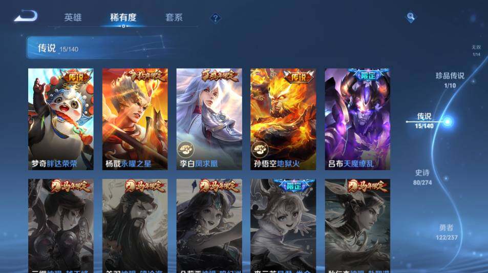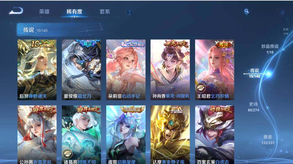 【传说皮肤】:后羿神树通天,夏侯惇霜北刀,朵莉亚心动手记,孙尚香乘龙问璇玑,王昭君乞巧织情,公孙离祈雪灵祝,诸葛亮时雨天司,虞姬启明星使,达摩黄金狮子座,百里玄策白虎志,梦奇胖达荣荣,杨戬永曜之星,李白凤求凰,孙悟空地狱火,吕布天魔缭乱
