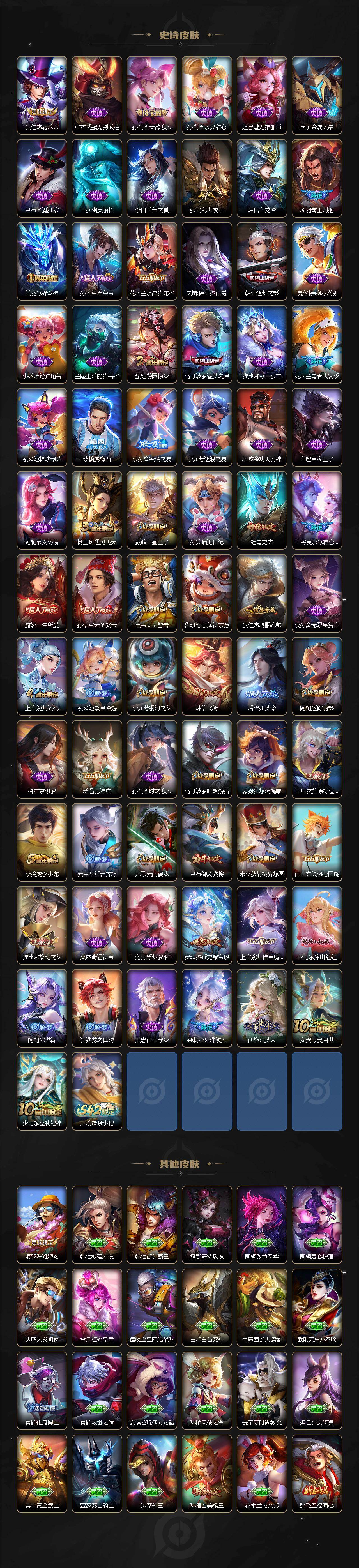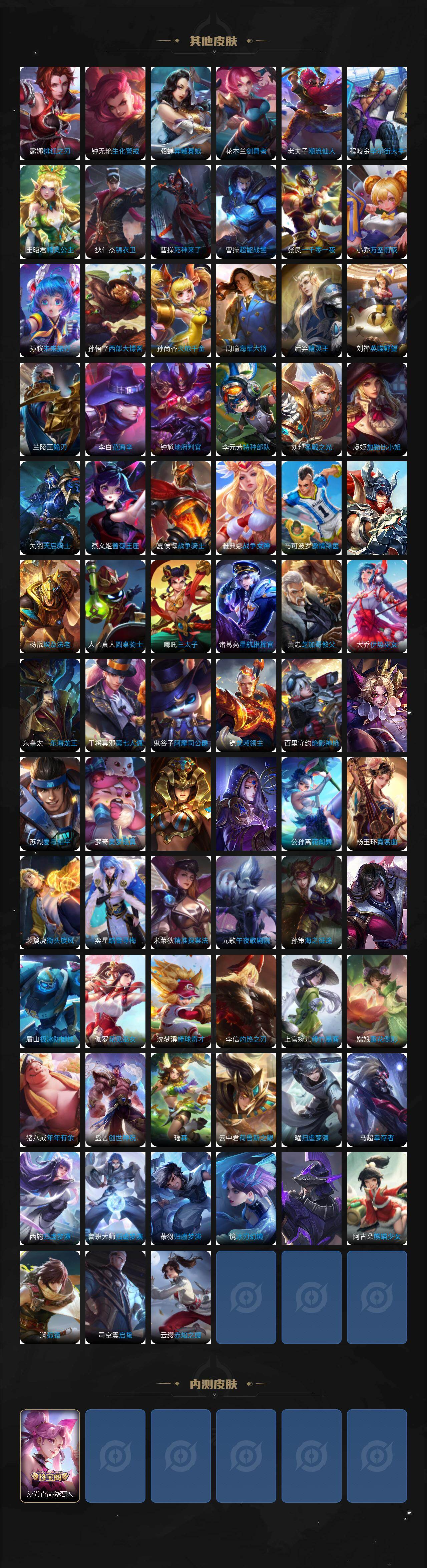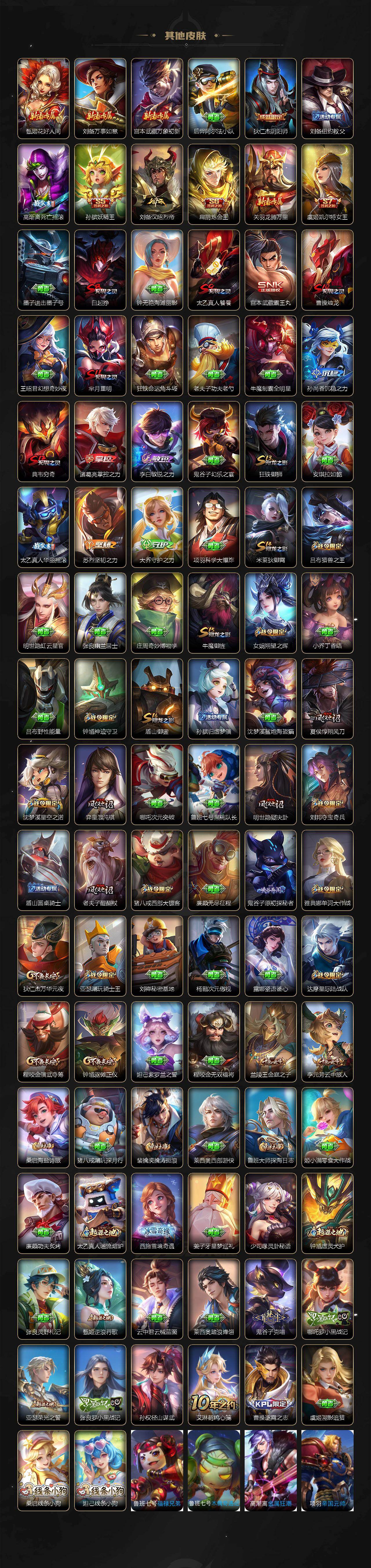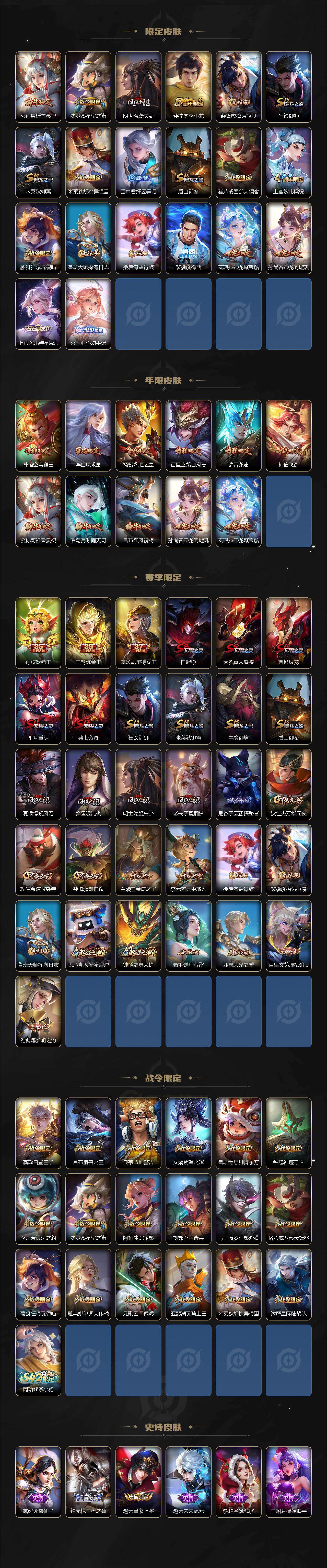 【限定皮肤】:白起狰,夏侯惇霜北刀,狄仁杰阴阳师,虞姬凯尔特女王,赵云皇家上将,嬴政白昼王子,孙尚香蔷薇恋人,鲁班七号狮舞东方,高渐离死亡摇滚,阿轲迷踪丽影,钟无艳王者之锤,孙膑妖精王,扁鹊炼金王,芈月重明,吕布天魔缭乱,吕布猎兽之王,吕布御风骁将,元歌云间偶戏,夏侯惇朔风刀,甄姬游园惊梦,曹操烛龙,典韦穷奇,典韦蓝屏警告,马可波罗逐梦之星,马可波罗暗影游猎,狄仁杰魔术师,狄仁杰万华元夜,达摩星际陆战队,项羽海滩派对,项羽霸王别姬,老夫子醍醐杖,关羽冰锋战神,程咬金演武夺筹,露娜一生所爱,刘邦夺宝奇兵,韩信逐梦之影,韩信飞衡,兰陵王金庭之子,花木兰青春决赛季,亚瑟潮玩骑士王,孙悟空美猴王,孙悟空至尊宝,孙悟空大圣娶亲,牛魔御旌,后羿如梦令,李元芳银河之约,李元芳云中旅人,虞姬启明星使,钟馗神迹守卫,钟馗驱傩正仪,杨玉环遇见飞天,杨戬永曜之星,女娲朔望之晖,干将莫邪冰霜恋舞曲,雅典娜单词大作战,雅典娜黎明之约,蔡文姬繁星吟游,太乙真人饕餮,太乙真人华丽摇滚,鬼谷子原初探秘者,诸葛亮时雨天司,铠青龙志,百里玄策白虎志,百里玄策原初追逐者,弈星混沌棋,公孙离蜜橘之夏,公孙离祈雪灵祝,沈梦溪星空之诺,明世隐疑决卦,裴擒虎李小龙,裴擒虎擒涛扼浪,狂铁御狮,米莱狄御霄,米莱狄胡桃异想国,云中君纤云弄巧,盾山御銮,猪八戒西部大镖客,上官婉儿梁祝,蒙犽狂想玩偶喵,鲁班大师探海日志,桑启海盐诗旅,裴擒虎梅西,安琪拉乘龙聚宝船,孙尚香乘龙问璇玑,上官婉儿群星魔术团,朵莉亚心动手记