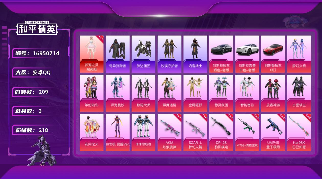 [16950714]安卓 手Q-1神装-13粉装-7特效枪-3载具-7粉色飞行器-93697热力值-13王牌印记-209套装-218枪皮 【红色神装等级】:梦海之灵-妮芮妲(一级) 【红色角色神装】:梦海之灵-妮芮妲 【热门品类】:粉装-梦幻火箭,粉装-缤纷油彩,套装-奇异狩猎者,套装-胖达团团,套装-沙漠守护者,套装-浪客战士,套装-龟仙人,套装-潮萌小黄鸭,套装-暗影哥特,套装-浪漫波比,套装-粉红小猪,角色-8号机,角色-Mark.06,熔岩游骑兵连帽夹克 【粉色套装】:粉装-深海曼妙,粉装-数码大师,粉装-蝶舞迷情,粉装-梦幻火箭,粉装-金属狂野,粉装-静灵氛围,粉装-智能音符,粉装-缤纷油彩,粉装-放客神游,粉装-古堡领主,粉装-花间之火,角色-初号机 觉醒Ver.,粉装-未来领航者 【粉色枪皮等级】:AKM-炫紫旋律(七级),SCAR-L-梦幻火箭(六级),M762-青锋波束(五级),UMP45-量子极限(五级),Kar98K-巳巳如意(五级),DP-28-扶摇飞仙(五级),DP-28-豹影疾电(五级) 【粉色载具】:特斯拉Model 3(冷光银),特斯拉Model X(珍珠白),阿斯顿马丁DBS(红) 【粉色枪皮】:AKM-炫紫旋律,SCAR-L-梦幻火箭,M762-青锋波束,UMP45-量子极限,Kar98K-巳巳如意,DP-28-扶摇飞仙,DP-28-豹影疾电 【粉色飞行器】:春暖花开飞行器,梦幻火箭飞行器,炫紫旋律飞行器,神秘黑猫飞行器,古堡领主飞行器,锦绣火鲤飞行器,深渊漩涡飞行器 【粉色降落伞】:深海曼妙降落伞,幻影战神降落伞,百万伏特降落伞,至尊龙雀降落伞,春暖花开降落伞,梦幻火箭降落伞,天启纪元降落伞,炫紫旋律降落伞,神秘黑猫降落伞,古堡领主降落伞,繁花小夜曲降落伞,马卡龙降落伞,花间之火降落伞,潮汐统领降落伞,锦绣火鲤降落伞,江南烟雨降落伞,精灵梦叶罗丽降落伞,创世·救赎降落伞,星梦奇缘降落伞,初号机 觉醒Ver.降落伞,金丰海韵降落伞,月影灵韵降落伞 【稀有套装】:套装-龟仙人,套装-雏菊兔兔,套装-萝兰蝴蝶,套装-小熊娃娃,角色-达芬奇,套装-蓝海鲸歌 【稀有枪皮】:AKM-PEL轰鸣竞梦者,AKM-四圣焕新,AKM-夜灯,AKM-奇异狩猎者,AKM-春暖花开,AKM-沙漠守护者,AKM-灼热熔岩,AKM-缤纷海域,AKM-霓虹街区,M16A4-幻世