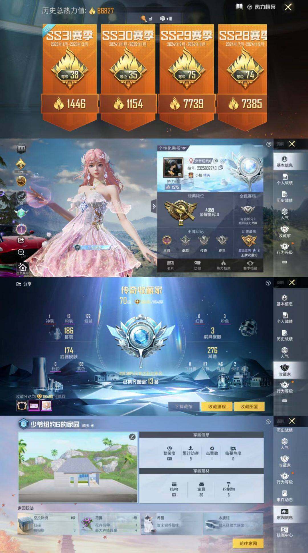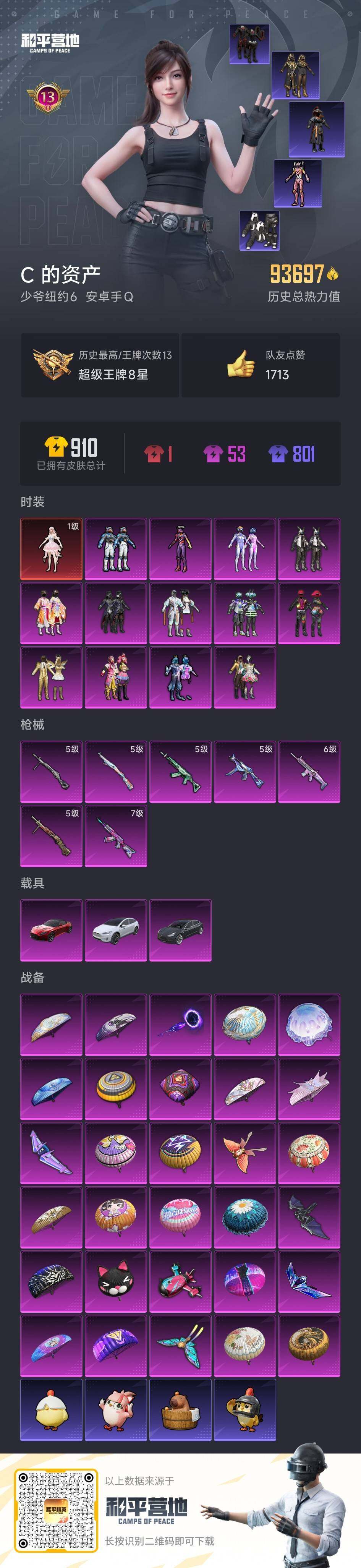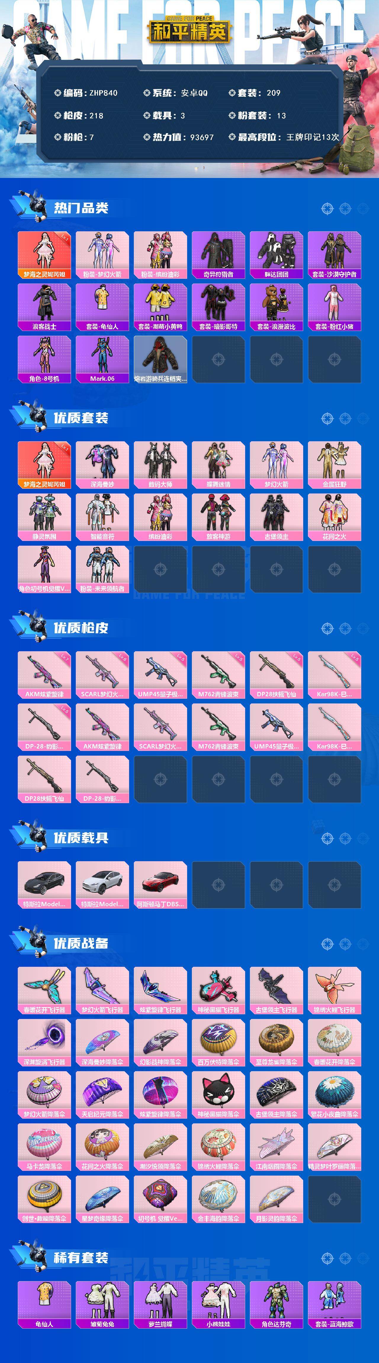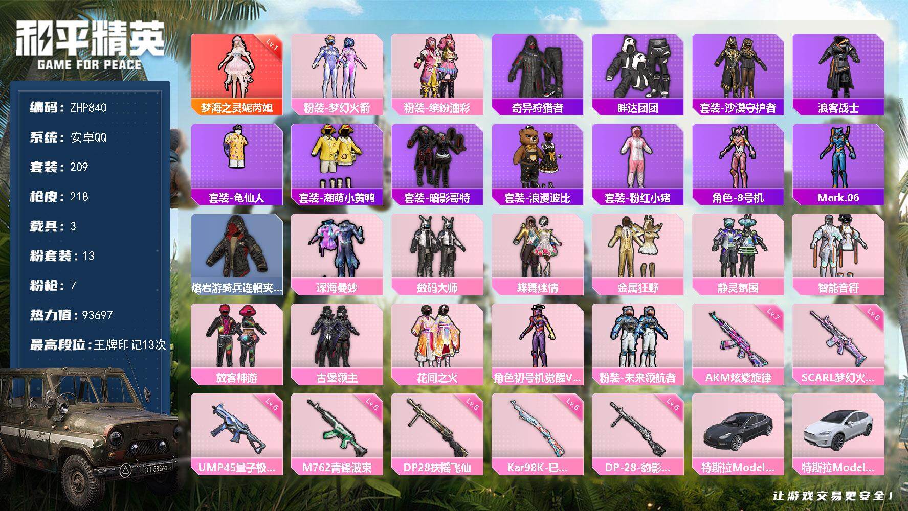 [16950714]安卓 手Q-1神装-13粉装-7特效枪-3载具-7粉色飞行器-93697热力值-13王牌印记-209套装-218枪皮