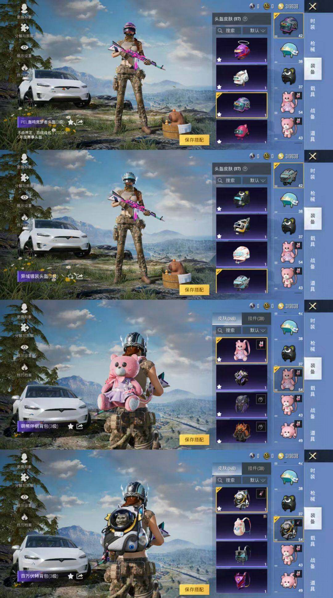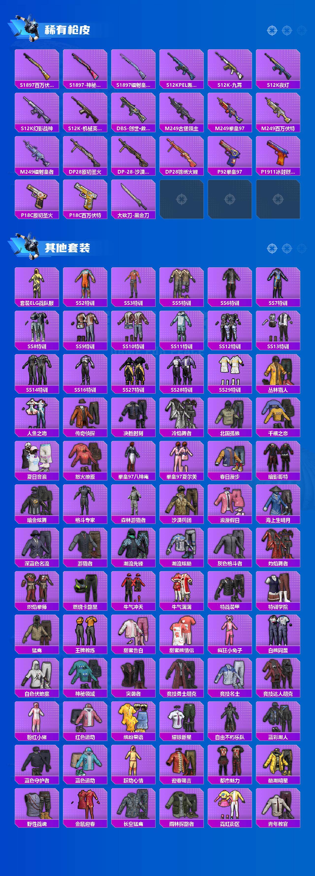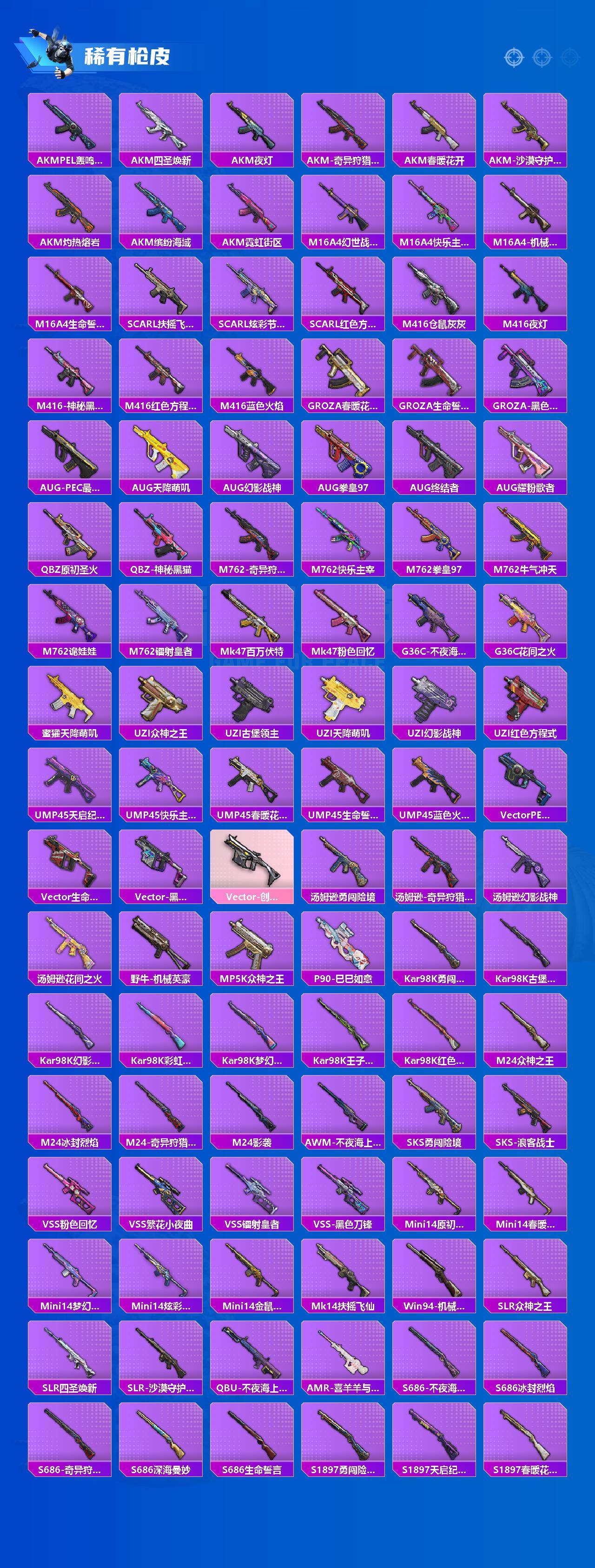 AKM-奇异狩猎者,AKM-缤纷海域,M416-仓鼠灰灰,AUG-PEC最牛战神,M762-奇异狩猎者,Kar98K-古堡领主,M24-奇异狩猎者,S686-奇异狩猎者,M249-古堡领主