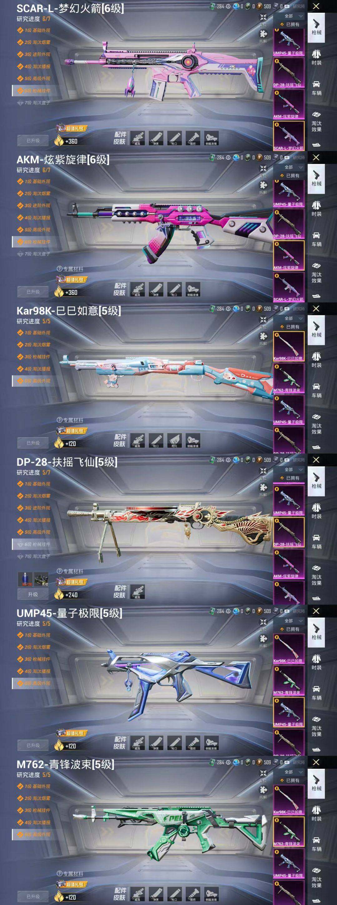 AKM-炫紫旋律,SCAR-L-梦幻火箭,M762-青锋波束,UMP45-量子极限,Kar98K-巳巳如意,DP-28-扶摇飞仙