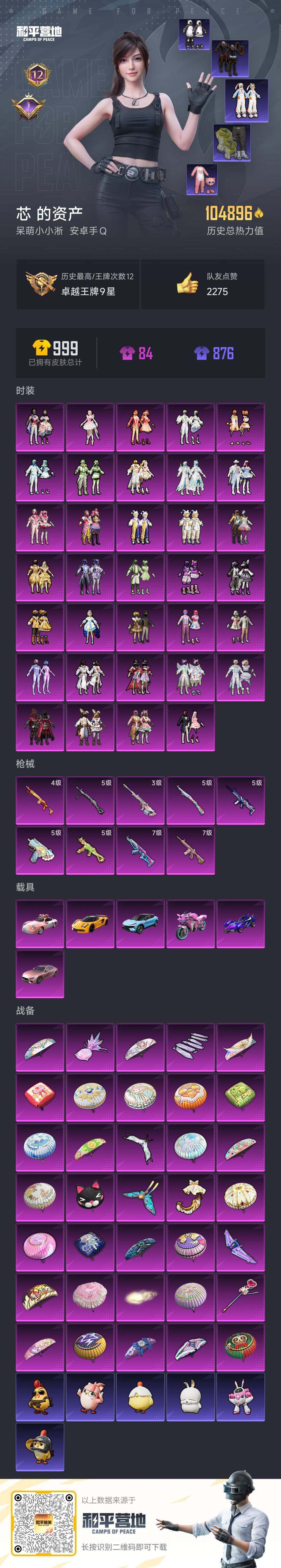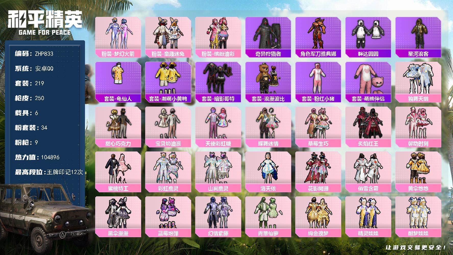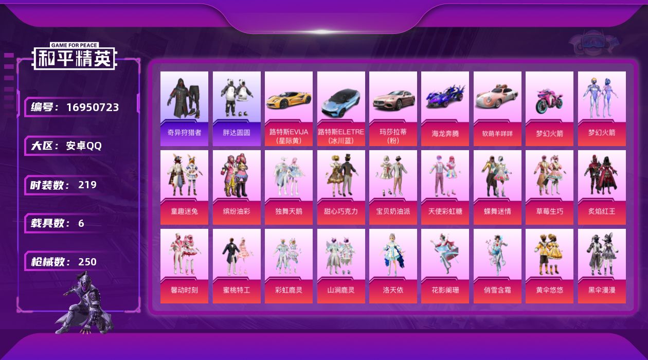 [16950723]安卓 手Q-34粉装-9特效枪-6载具-8粉色飞行器-104896热力值-12王牌印记-219套装-250枪皮