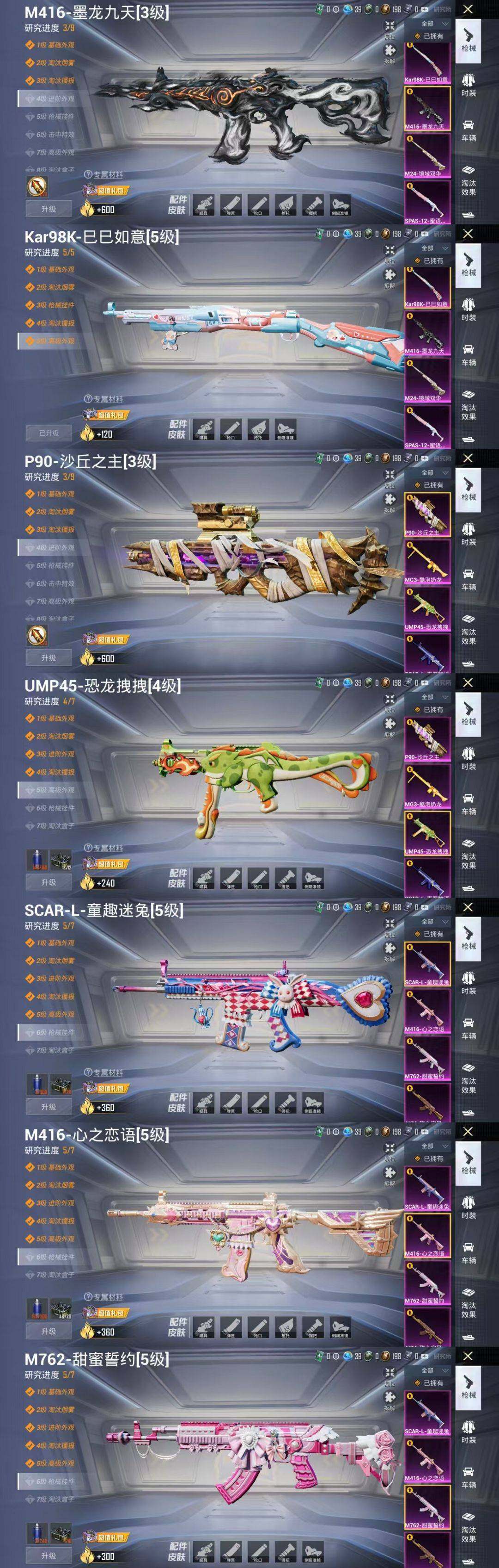 【粉色枪皮等级】:AKM-梦之光华(七级),SCAR-L-青春物语(五级),M416-心之恋语(七级),UZI-筑梦精灵(五级),UMP45-恐龙拽拽(五级),Kar98K-巳巳如意(五级),AMR-智耀战神(三级),DP-28-豹影疾电(五级)