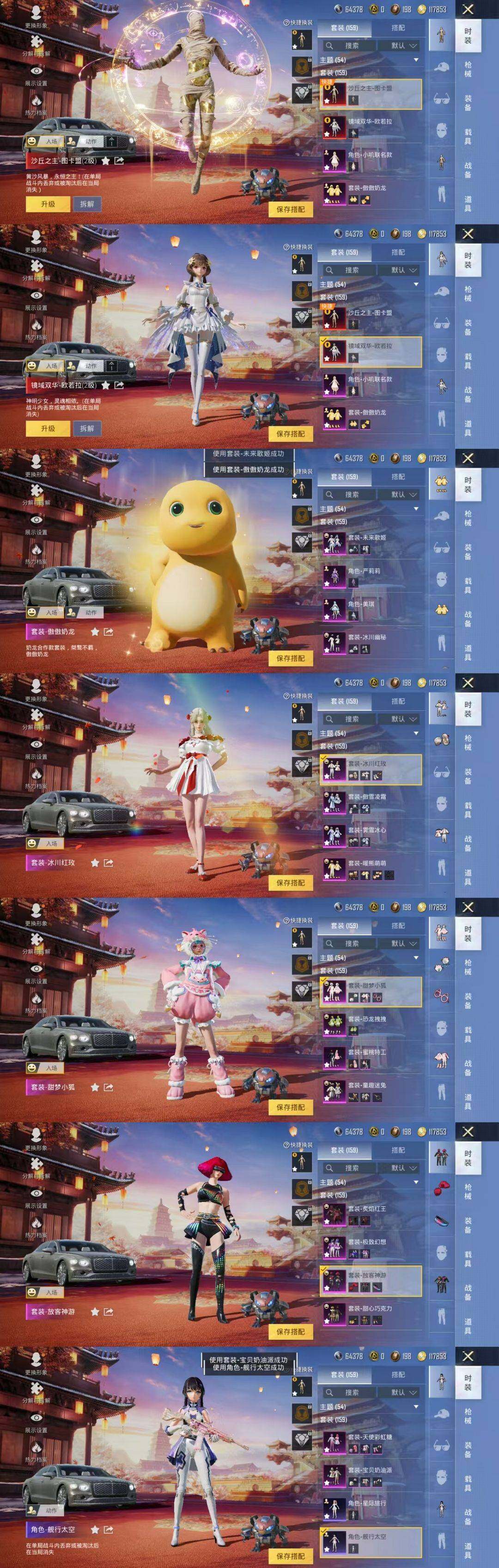 【粉色载具】:路特斯EVIJA(星际黄),路特斯ELETRE(冰川蓝),玛莎拉蒂Ghibli(粉),海龙奔腾,软萌羊咩咩,双人摩托-梦幻火箭