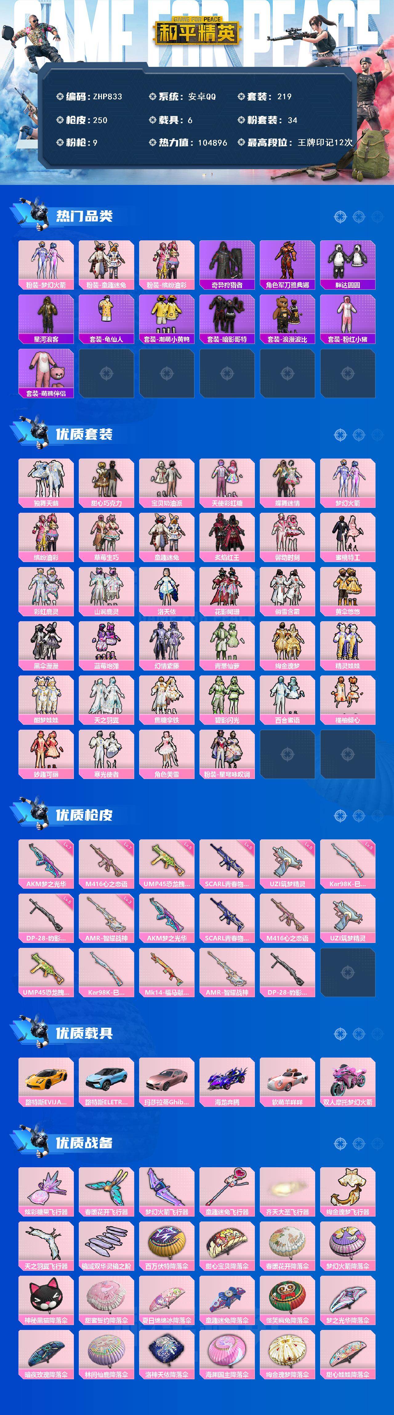 [16950723]安卓 手Q-34粉装-9特效枪-6载具-8粉色飞行器-104896热力值-12王牌印记-219套装-250枪皮 【热门品类】:粉装-梦幻火箭,粉装-童趣迷兔,粉装-缤纷油彩,套装-奇异狩猎者,角色-军刀雅典娜,套装-胖达圆圆,套装-星河浪客,套装-龟仙人,套装-潮萌小黄鸭,套装-暗影哥特,套装-浪漫波比,套装-粉红小猪,套装-萌熊伴侣 【粉色套装】:粉装-独舞天鹅,粉装-甜心巧克力,粉装-宝贝奶油派,粉装-天使彩虹糖,粉装-蝶舞迷情,粉装-梦幻火箭,粉装-缤纷油彩,粉装-草莓生巧,粉装-童趣迷兔,粉装-炙焰红王,粉装-馨动时刻,粉装-蜜桃特工,粉装-彩虹鹿灵,粉装-山涧鹿灵,角色-洛天依,粉装-花影阑珊,粉装-俏雪含霜,粉装-黄伞悠悠,粉装-黑伞漫漫,粉装-蓝莓炮弹,粉装-幻情紫藤,粉装-青葱仙萝,粉装-绚金瑰梦,粉装-精灵娃娃,粉装-酣梦娃娃,粉装-天之羽翼,粉装-焦糖拿铁,粉装-碧影闪光,粉装-百合蜜语,粉装-橘柚倾心,粉装-妙趣可丽,粉装-寒光使者,角色-美雪,粉装-星穹咏叹调 【粉色枪皮等级】:AKM-梦之光华(七级),SCAR-L-青春物语(五级),M416-心之恋语(七级),UZI-筑梦精灵(五级),UMP45-恐龙拽拽(五级),Kar98K-巳巳如意(五级),AMR-智耀战神(三级),DP-28-豹影疾电(五级) 【粉色载具】:路特斯EVIJA(星际黄),路特斯ELETRE(冰川蓝),玛莎拉蒂Ghibli(粉),海龙奔腾,软萌羊咩咩,双人摩托-梦幻火箭 【粉色枪皮】:AKM-梦之光华,SCAR-L-青春物语,M416-心之恋语,UZI-筑梦精灵,UMP45-恐龙拽拽,Kar98K-巳巳如意,Mk14-福马献瑞,AMR-智耀战神,DP-28-豹影疾电 【粉色飞行器】:炫彩糖果飞行器,春暖花开飞行器,梦幻火箭飞行器,童趣迷兔飞行器,齐天大圣飞行器,绚金瑰梦飞行器,天之羽翼飞行器,镜域双华-灵镜之阶 【粉色降落伞】:百万伏特降落伞,甜心宝贝降落伞,春暖花开降落伞,梦幻火箭降落伞,神秘黑猫降落伞,甜蜜誓约降落伞,夏日绵绵冰降落伞,童趣迷兔降落伞,怪笑疯兔降落伞,梦之光华降落伞,暗夜玫瑰降落伞,林间仙鹿降落伞,洛神天依降落伞,海渊国主降落伞,绚金瑰梦降落伞,甜心娃娃降落伞,天之羽翼降落伞,碧影闪光降落伞,百合蜜语降落伞,恐龙拽拽降落伞,橘柚倾心降落伞,筑梦精灵