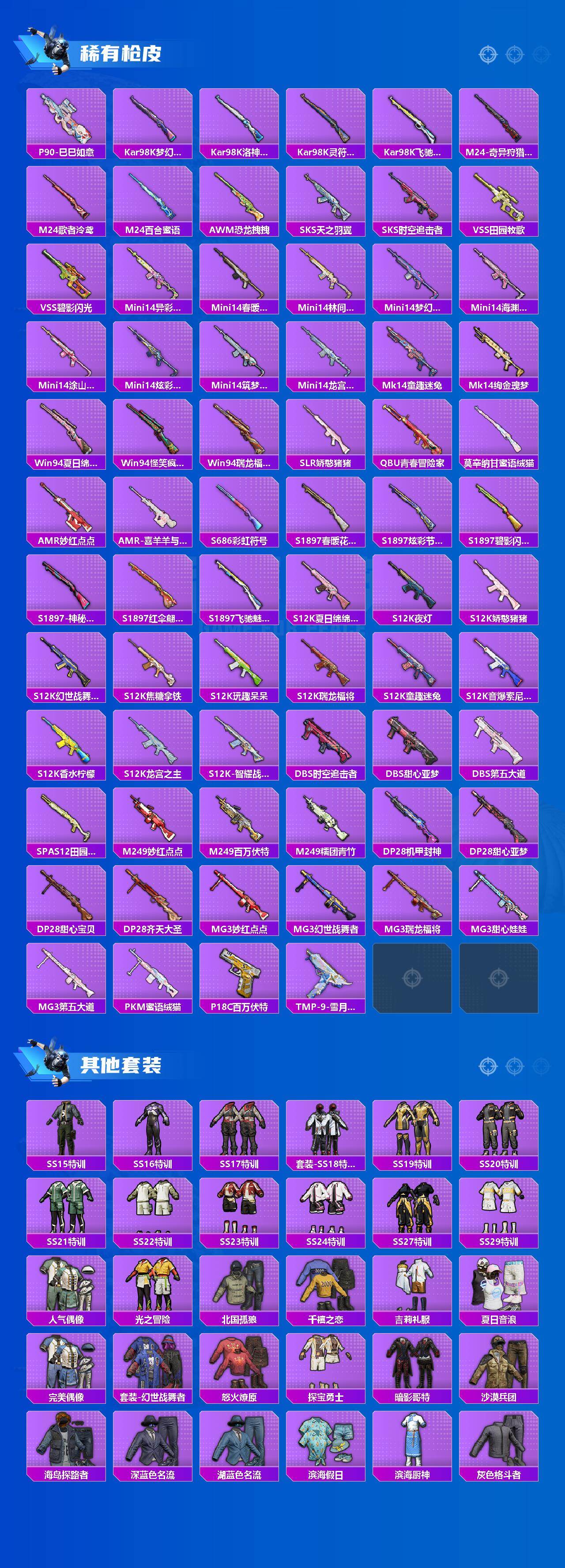 AKM-百万伏特,M416-仓鼠灰灰,GROZA-林间仙鹿,M762-奇异狩猎者,M762-瑞龙福将,M762-风花雪月,M24-奇异狩猎者,Mini14-林间仙鹿