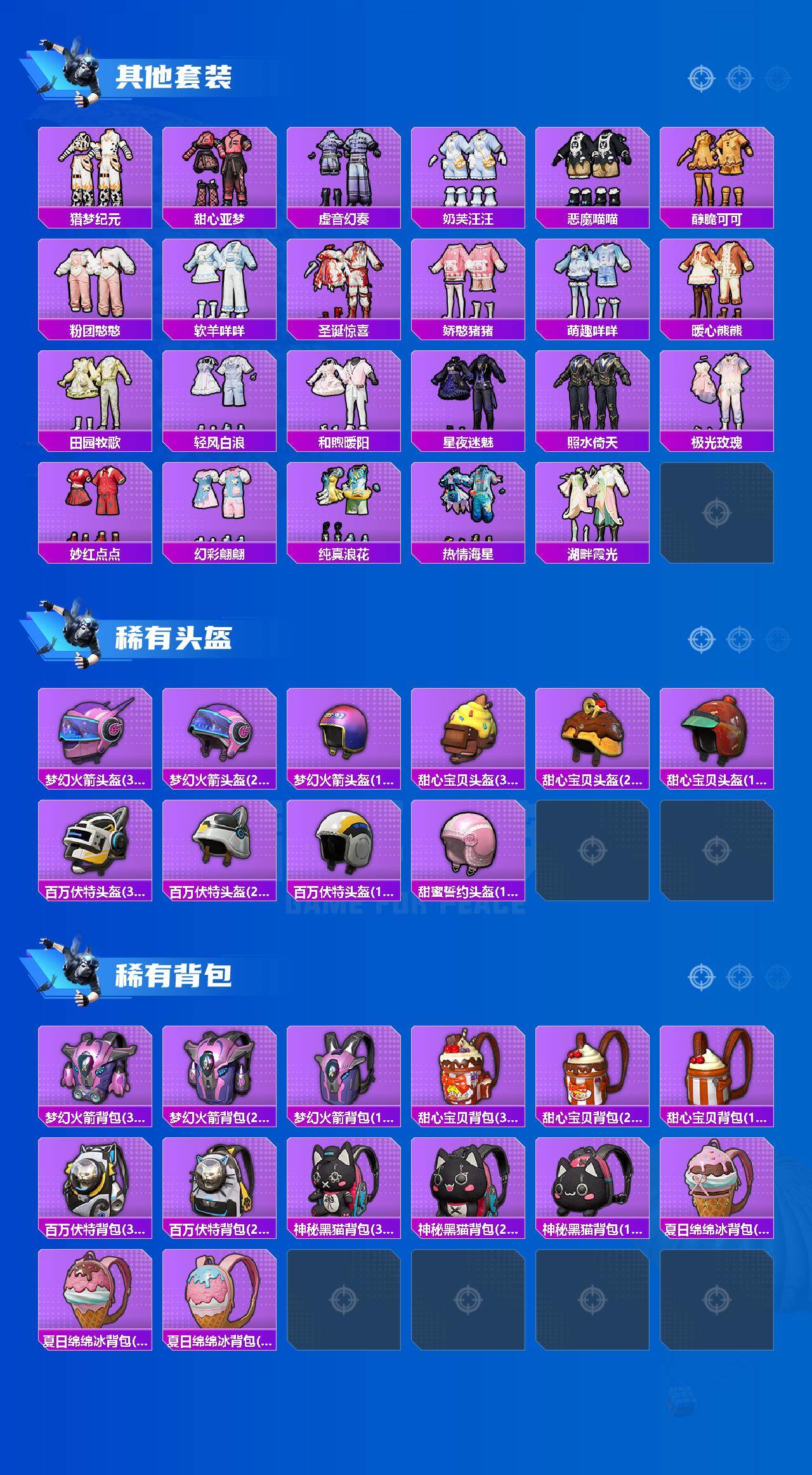 【热门品类】:粉装-梦幻火箭,粉装-童趣迷兔,粉装-缤纷油彩,套装-奇异狩猎者,角色-军刀雅典娜,套装-胖达圆圆,套装-星河浪客,套装-龟仙人,套装-潮萌小黄鸭,套装-暗影哥特,套装-浪漫波比,套装-粉红小猪,套装-萌熊伴侣