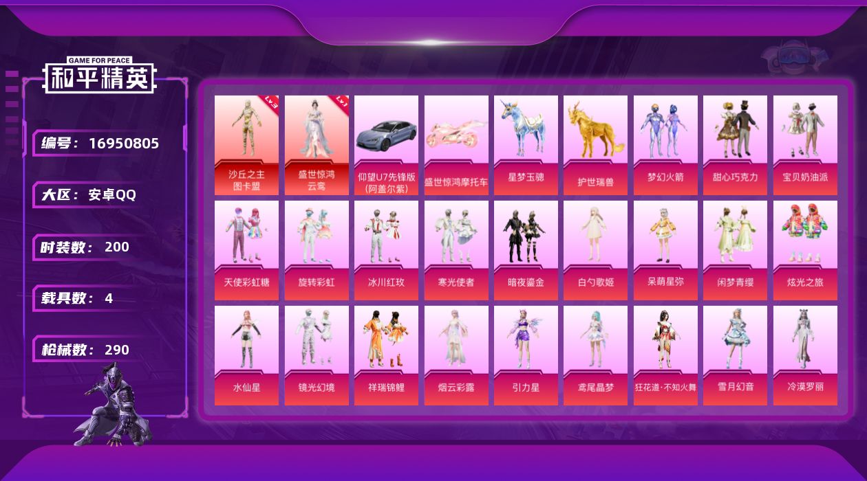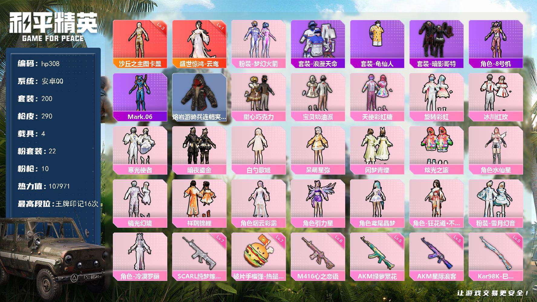 [16950805]安卓 手Q-2神装-22粉装-10特效枪-4载具-16粉色飞行器-107971热力值-16王牌印记-200套装-290枪皮