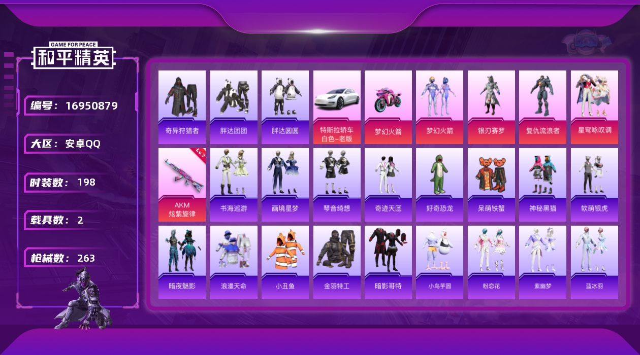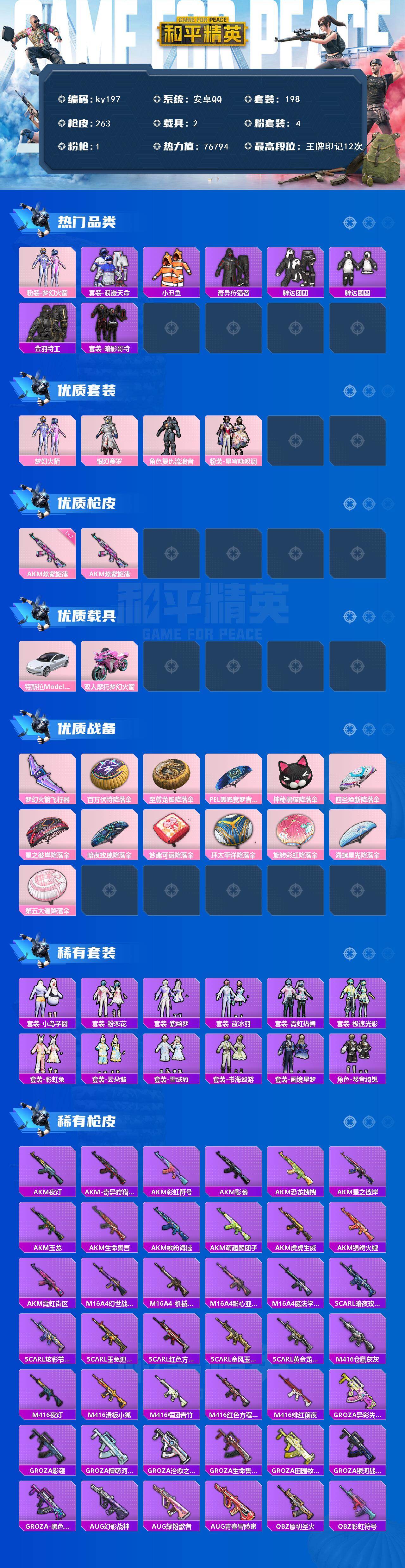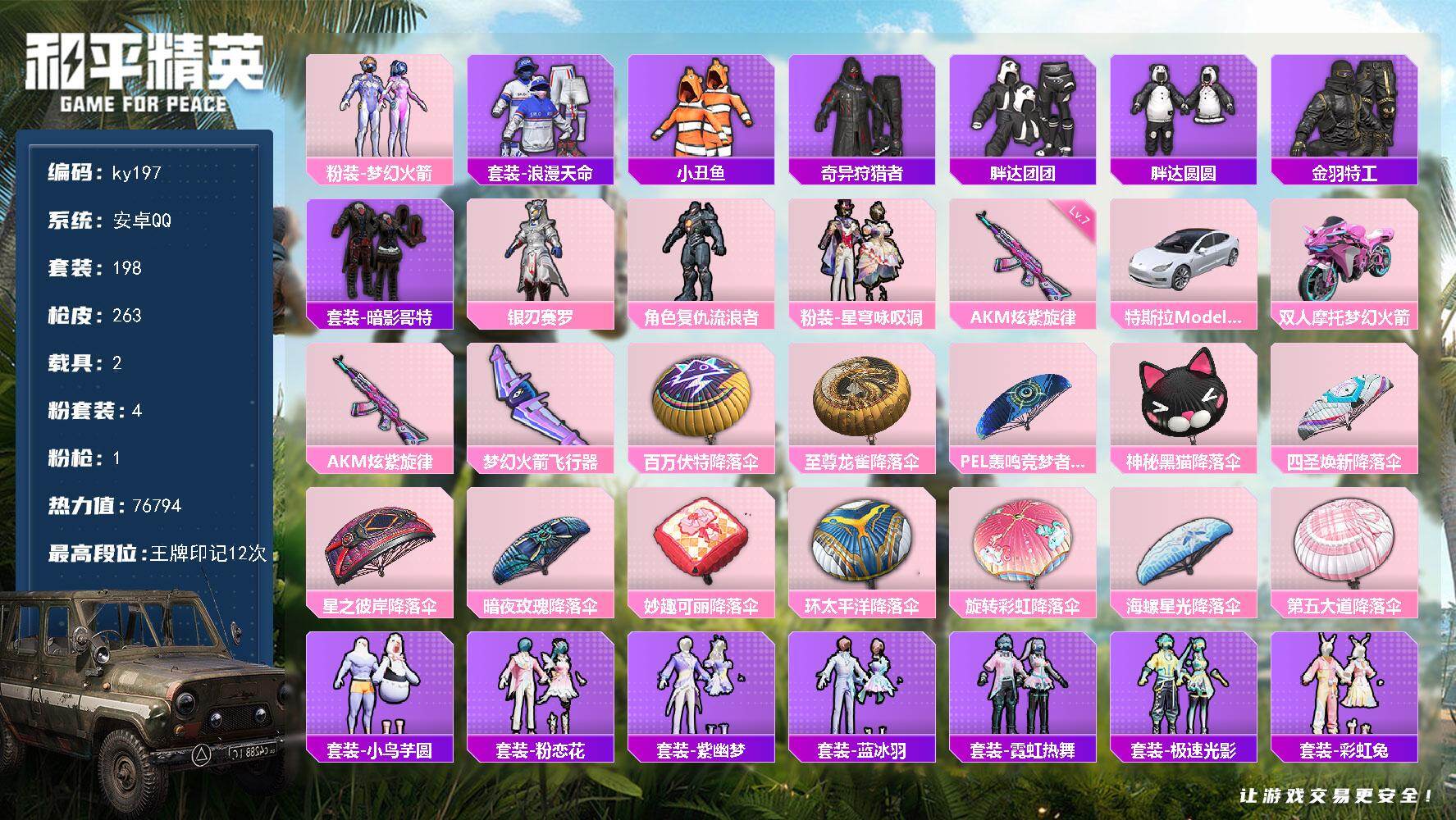 [16950879]安卓 手Q-4粉装-1特效枪-2载具-1粉色飞行器-76794热力值-12王牌印记-198套装-263枪皮 【热门品类】:粉装-梦幻火箭,套装-浪漫天命,套装-小丑鱼,套装-奇异狩猎者,套装-胖达团团,套装-胖达圆圆,套装-金羽特工,套装-暗影哥特 【粉色套装】:粉装-梦幻火箭,粉装-银刃赛罗,角色-复仇流浪者,粉装-星穹咏叹调 【粉色枪皮等级】:AKM-炫紫旋律(七级) 【粉色载具】:特斯拉Model 3(珍珠白),双人摩托-梦幻火箭 【粉色枪皮】:AKM-炫紫旋律 【粉色飞行器】:梦幻火箭飞行器 【粉色降落伞】:百万伏特降落伞,至尊龙雀降落伞,PEL轰鸣竞梦者降落伞,神秘黑猫降落伞,四圣焕新降落伞,星之彼岸降落伞,暗夜玫瑰降落伞,妙趣可丽降落伞,环太平洋降落伞,旋转彩虹降落伞,海螺星光降落伞,第五大道降落伞 【稀有套装】:套装-小鸟芋圆,套装-粉恋花,套装-紫幽梦,套装-蓝冰羽,套装-霓虹热舞,套装-极速光影,套装-彩虹兔,套装-云朵鹅,套装-雪绒豹,套装-书海巡游,套装-画境星梦,套装-琴音绮想 【稀有枪皮】:AKM-夜灯,AKM-奇异狩猎者,AKM-彩虹符号,AKM-影袭,AKM-恐龙拽拽,AKM-星之彼岸,AKM-玉龙,AKM-生命誓言,AKM-缤纷海域,AKM-萌趣颜团子,AKM-虎虎生威,AKM-锦绣火鲤,AKM-霓虹街区,M16A4-幻世战舞者,M16A4-机械英豪,M16A4-甜心亚梦,M16A4-魔法学院,SCAR-L-暗夜玫瑰,SCAR-L-炫彩节奏,SCAR-L-玉兔迎春,SCAR-L-红色方程式,SCAR-L-金风玉露,SCAR-L-黄金龙骨,M416-仓鼠灰灰,M416-夜灯,M416-滑板小狐,M416-糯团青竹,M416-红色方程式,M416-绯红前夜,GROZA-异彩先驱,GROZA-影袭,GROZA-懵萌河马,GROZA-治愈之星,GROZA-生命誓言,GROZA-田园牧歌,GROZA-银河战甲,GROZA-黑色刀锋,AUG-幻影战神,AUG-耀粉歌者,AUG-青春冒险家,QBZ-原初圣火,QBZ-彩虹符号,M762-天降萌叽,M762-彩虹符号,M762-拳皇97,M762-牛气冲天,M762-瑞龙福将,M762-绯红前夜,M762-云朵鹅,Mk47-妙红点点,Mk47-青春冒险家,G36C-不夜海上花,G36C-懵萌河马,G