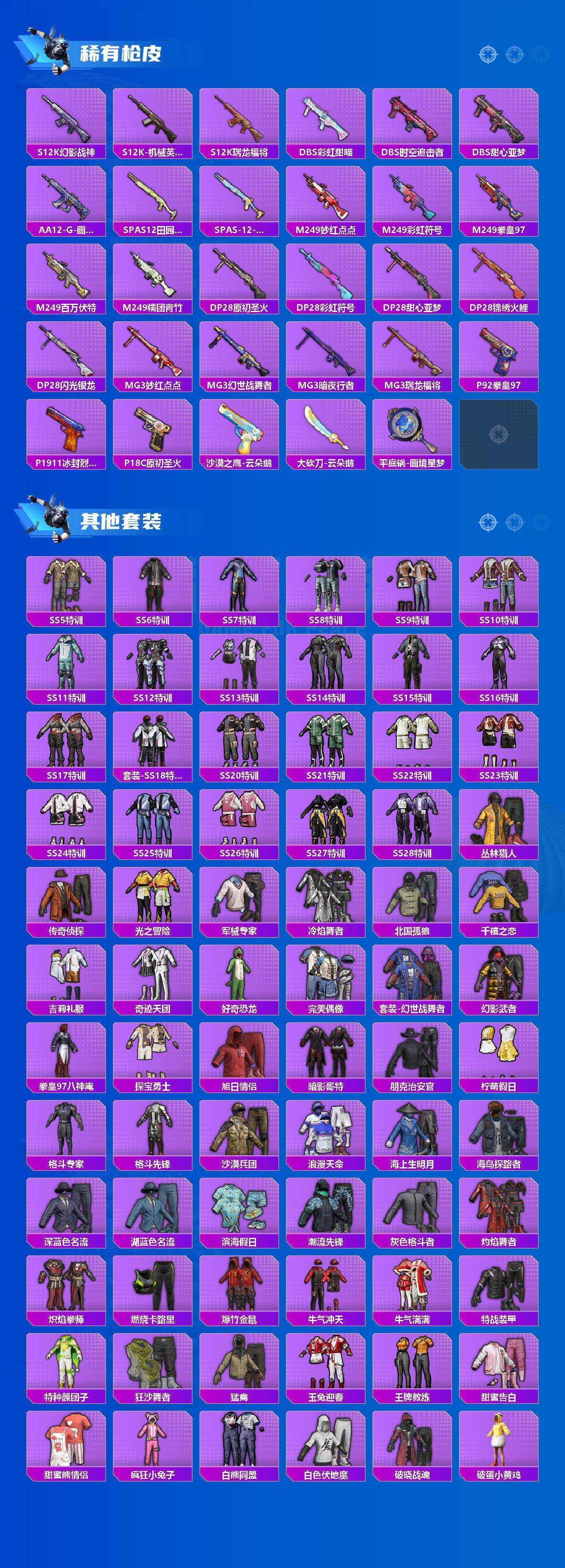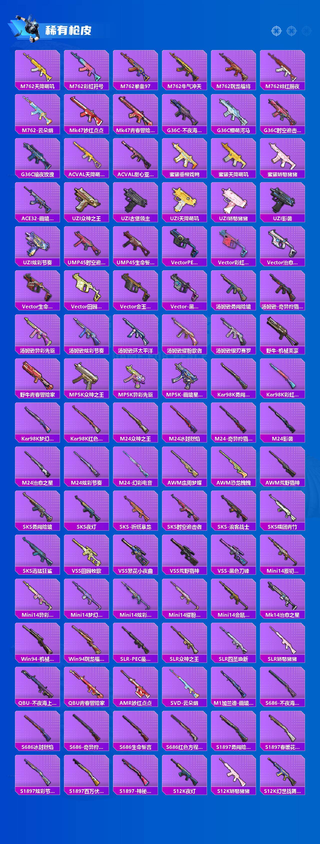 【稀有枪皮】:AKM-夜灯,AKM-奇异狩猎者,AKM-彩虹符号,AKM-影袭,AKM-恐龙拽拽,AKM-星之彼岸,AKM-玉龙,AKM-生命誓言,AKM-缤纷海域,AKM-萌趣颜团子,AKM-虎虎生威,AKM-锦绣火鲤,AKM-霓虹街区,M16A4-幻世战舞者,M16A4-机械英豪,M16A4-甜心亚梦,M16A4-魔法学院,SCAR-L-暗夜玫瑰,SCAR-L-炫彩节奏,SCAR-L-玉兔迎春,SCAR-L-红色方程式,SCAR-L-金风玉露,SCAR-L-黄金龙骨,M416-仓鼠灰灰,M416-夜灯,M416-滑板小狐,M416-糯团青竹,M416-红色方程式,M416-绯红前夜,GROZA-异彩先驱,GROZA-影袭,GROZA-懵萌河马,GROZA-治愈之星,GROZA-生命誓言,GROZA-田园牧歌,GROZA-银河战甲,GROZA-黑色刀锋,AUG-幻影战神,AUG-耀粉歌者,AUG-青春冒险家,QBZ-原初圣火,QBZ-彩虹符号,M762-天降萌叽,M762-彩虹符号,M762-拳皇97,M762-牛气冲天,M762-瑞龙福将,M762-绯红前夜,M762-云朵鹅,Mk47-妙红点点,Mk47-青春冒险家,G36C-不夜海上花,G36C-懵萌河马,G