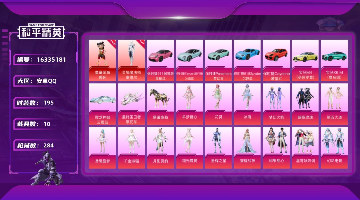 [16335181]【特价出售/店主推荐】安卓 手Q-2神装-24粉装-11特效枪-1僚机-10载具-16粉色飞行器-116401热力值-8王牌印记-195套装-284枪皮 【红色神装等级】:魔童闹海-哪吒(二级),灵猫魔法师-塞维尔(一级) 【红色角色神装】:魔童闹海-哪吒,灵猫魔法师-塞维尔 【热门品类】:粉装-梦幻火箭,套装-浪漫天命,套装-龟仙人,套装-暗影哥特,套装-浪漫波比,角色-六号稻草人 【粉色套装】:粉装-梦幻火箭,粉装-暗夜玫瑰,粉装-第五大道,角色-鸢尾晶梦,角色-千金淑猫,角色-月影灵韵,角色-翎光蝶翼,角色-圣辉之星,角色-智耀战神,粉装-绯果甜心,粉装-星穹咏叹调,粉装-幻彩电音,角色-时光之吻,角色-狂魅哈莉,角色-绯月迷踪,角色-罗征,角色-绯穹魔姬,角色-奇迹舞步 贝贝,角色-奇迹舞步 雅雅,角色-奇迹舞步 美琪,角色-奇迹舞步 美雪,角色-花灵,角色-冰魄,角色-羊梦糖心 【粉色枪皮等级】:M416-风花雪月(七级),M416-灵猫魔法师(六级),AUG-暖羊咩咩(五级),AKS-74U-星穹咏叹调(五级),Kar98K-巳巳如意(五级),AWM-天使羽翼(四级),Mk14-樱桃泡泡(六级),SLR-暗夜玫瑰(二级),DP-28-豹影疾电(五级),MG3-辉羽雀灵(三级),MG-36-幻彩电音(五级) 【粉色载具】:宝马M4(圣保罗黄),宝马X6 M(曼岛绿),霜龙神御(云雾蓝),保时捷911 敞篷版(星珀红),保时捷Taycan 旅行版(冰晶蓝),保时捷Panamera(梦幻青),保时捷918 Spyder(沉静蓝),保时捷Cayenne(激情红),最终圣卫者摩托车,僚机-萌兔起飞,黑曜夜骑 【粉色枪皮】:M416-风花雪月,M416-灵猫魔法师,AUG-暖羊咩咩,AKS-74U-星穹咏叹调,Kar98K-巳巳如意,AWM-天使羽翼,Mk14-樱桃泡泡,SLR-暗夜玫瑰,DP-28-豹影疾电,MG3-辉羽雀灵,MG-36-幻彩电音 【粉色飞行器】:梦幻火箭飞行器,凤舞九天飞行器,万象金身飞行器,圣域金龙飞行器,绯果甜心飞行器,幻海仙踪飞行器,雀灵庇佑飞行器,御兔特攻飞行器,时光之吻飞行器,终晖之翼飞行器,灵猫魔法师飞行器,奇迹舞步飞行器,飞天猪飞行器,灵珠游龙飞行器 【粉色降落伞】:甜心宝贝降落伞,梦幻火箭降落伞,暗夜玫瑰降落伞,洛神天依降落伞,