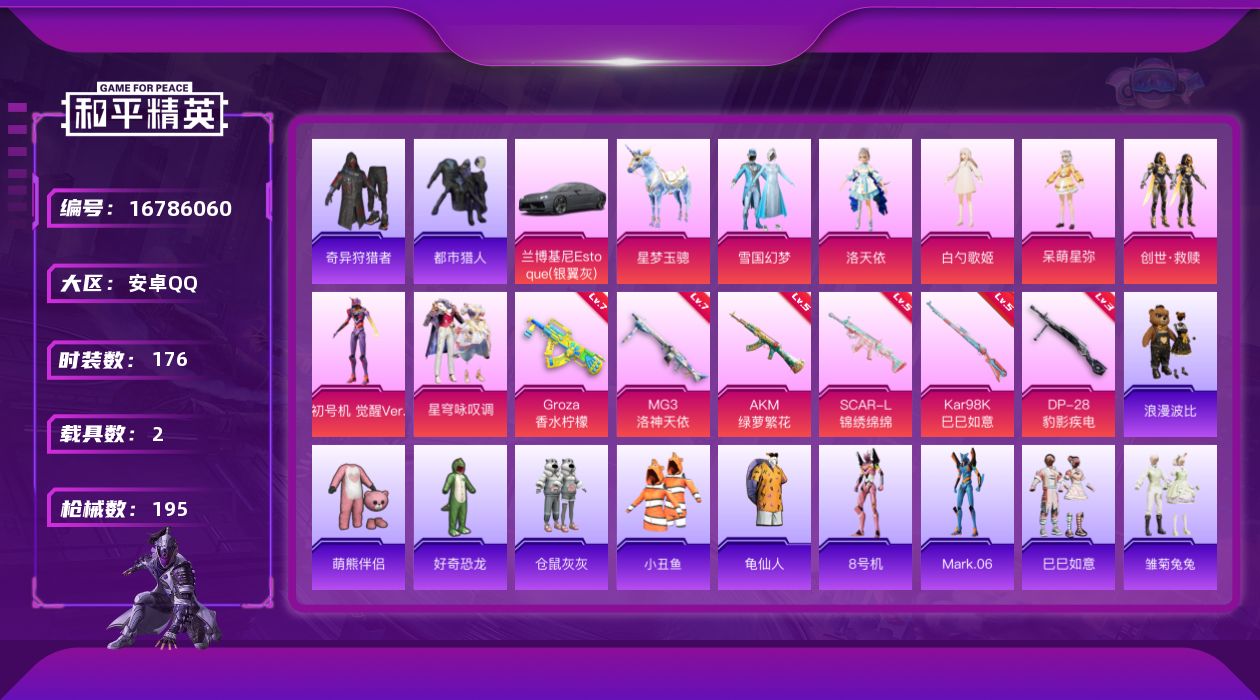 - [16999994]安卓 手Q-3粉装-6特效枪-0载具-2粉色飞行器-30540热力值-3王牌印记-64套装-117枪皮 【粉色套装】:粉装-幻彩电音,角色-异瞳寒姬,角色-罪夜之冕 【粉色枪皮等级】:AKS-74U-森灵之息(五级),Kar98K-巳巳如意(五级),AMR-智耀战神(七级),DP-28-豹影疾电(五级) 【粉色枪皮】:AKS-74U-森灵之息,Kar98K-巳巳如意,Mk14-福马献瑞,AMR-智耀战神,DP-28-豹影疾电 【粉色飞行器】:炫彩糖果飞行器,极意拳锋飞行器 【粉色降落伞】:星之彼岸降落伞,临安公主降落伞,雪月幻音降落伞,星穹咏叹调降落伞,幻星舰长降落伞,炫彩糖果降落伞 【稀有套装】:套装-巳巳如意,套装-雪国风尚,套装-炫彩糖果,套装-燕燕于飞,套装-鱼渊荷华,角色-糖霜甜心,套装-紫幽梦,套装-蓝冰羽,套装-星渊小夜曲,套装-云朵鹅,套装-雪绒豹,角色-灵公主,套装-朱霞炽焰,套装-凌霄紫焰,套装-擎苍青焰,玩偶服-懒羊羊,角色-绯色魅影,角色-紫俏灵猫,角色-月烬之祷,套装-雨过天青,套装-红釉青花 【稀有枪皮】:AUG-冰晶雪宝,AKM-星之彼岸,AKM-龙的传人,SCAR-L-夜灯,SCAR-L-红色方程式,M416-蓝色火焰,AUG-耀粉歌者,AUG-月影灵韵,M762-天降萌叽,M762-云朵鹅,G36C-星穹咏叹调,ARX-凌霄紫焰,UZI-啾咪啾咪,UZI-天降萌叽,UMP45-夜灯,UMP45-春暖花开,UMP45-生命誓言,UMP45-极意拳锋,Vector-生命誓言,汤姆逊-耀粉歌者,JS9-凌霄紫焰,P90-巳巳如意,Kar98K-星穹咏叹调,VSS-星之彼岸,Mini14-春暖花开,AMR-喜羊羊与灰太狼,SVD-云朵鹅,S686-巳巳如意,S12K-夜灯,DBS-幻彩电音,SPAS-12-云朵鹅,M249-星之彼岸,M249-糯团青竹,MG3-幻世战舞者,MG-36-凌霄紫焰,P92-凌霄紫焰,短管霰弹-星穹咏叹调,沙漠之鹰-云朵鹅,大砍刀-云朵鹅,平底锅-凌霄紫焰,破片手榴弹-巳巳如意 【其他套装】:套装-丛林猎人,套装-冷焰舞者,套装-完美偶像,套装-幻影武者,套装-灼焰舞者,套装-王牌教练,套装-白色伏地魔,套装-竞技名士,套装-长空猛禽,套装-青年教官,套装-青涩时光,套装-青羽突袭者,套装-魅力单车,套装-黑色