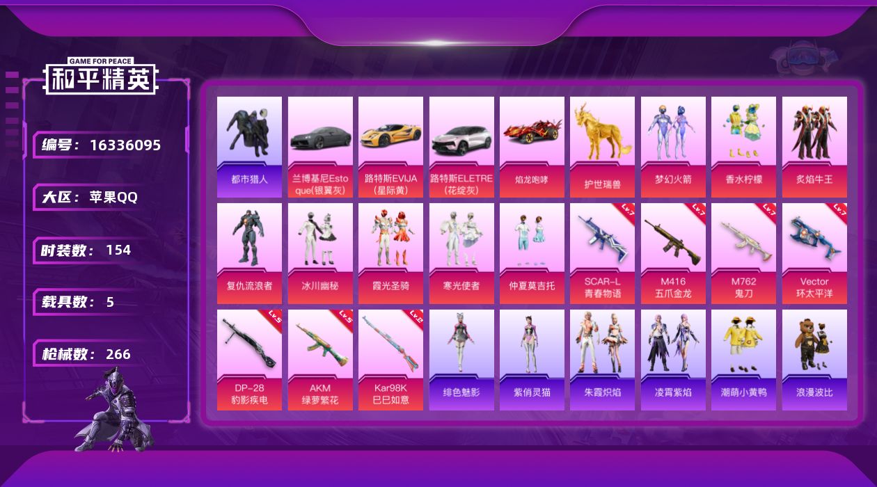 [16336095]【特价出售/店主推荐】苹果 手Q-无敌战神框-8粉装-7特效枪-5载具-3粉色飞行器-85453热力值-11王牌印记-154套装-266枪皮