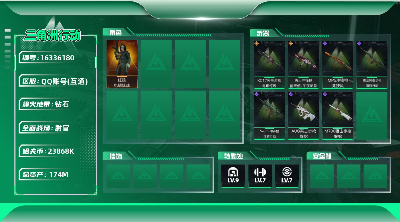 [16336180]【特价出售/店主推荐】174m总资产-23868k哈伏币-60烽火等级-钻石-25战场等级-尉官 【干员外观】:红狼-电锯惊魂 【近战皮肤】:近战-黑鹰 【传说外观】:KC17突击步枪-电锯惊魂,勇士冲锋枪-能天使-午夜邮差 【史诗外观】:AUG突击步枪-蝮蛇,腾龙突击步枪-猎鳄行动,MP5冲锋枪-竞技风,Vector冲锋枪-猎鳄行动,M700狙击步枪-蝮蛇 【稀有外观】:AKM突击步枪-肃杀,AUG突击步枪-全金属外壳,M7战斗步枪-精英联盟,SCAR-H战斗步枪-荣耀列队,腾龙突击步枪-冰天雪地,MP5冲锋枪-哈夫克卫队,MP5冲锋枪-精英联盟,UZI冲锋枪-精英联盟,UZI冲锋枪-亚特兰蒂斯,SMG-45-行动开启,勇士冲锋枪-精英联盟,勇士冲锋枪-冰天雪地,Mini-14射手步枪-荣耀列队,SKS射手步枪-弄臣,SR-25射手步枪-开拓,SR-25-行动开启,SR9射手步枪-肃杀 【普通外观】:M4A1突击步枪-粉色涂装,M4A1突击步枪-高雅黑,M4A1突击步枪-海色,QBZ95-1突击步枪-高雅黑,QBZ95-1突击步枪-海浪,QBZ95-1突击步枪-海色,K416突击步枪-几何迷彩,K416突击步枪-高雅黑,M16A4突击步枪-高雅黑,AUG突击步枪-浅蓝涂装,M7战斗步枪-红色涂装,SG552突击步枪-浅蓝涂装,SG552突击步枪-海浪,SCAR-H战斗步枪-红色涂装,SCAR-H战斗步枪-数码迷彩,G3战斗步枪-高雅黑,PTR-32突击步枪-黄蜂,MP5冲锋枪-黄蜂,Vector冲锋枪-几何迷彩,野牛冲锋枪-高雅黑,SR-3M紧凑突击步枪-三角洲力量,M1014霰弹枪-高雅黑,M1014霰弹枪-海浪,M249轻机枪-黄蜂,SVD狙击步枪-高雅黑,SKS射手步枪-三角洲力量,SR-25射手步枪-黄蜂,沙漠之鹰-高雅黑 【挂饰】:挂饰-暗行哨兵*2,挂饰-枪匠