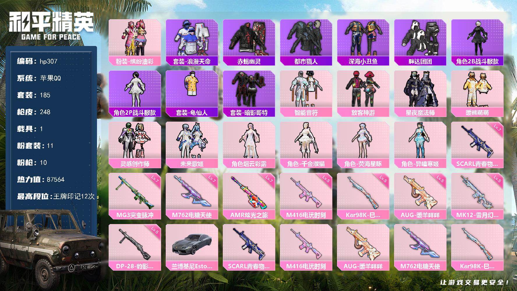 [16951305]苹果 手Q-11粉装-10特效枪-1载具-2粉色飞行器-87564热力值-12王牌印记-185套装-248枪皮 【热门品类】:粉装-缤纷油彩,套装-浪漫天命,套装-赤蝎幽灵,套装-都市猎人,套装-深海小丑鱼,套装-胖达团团,角色-2B战斗服款,角色-2P战斗服款,套装-龟仙人,套装-暗影哥特 【粉色套装】:粉装-智能音符,粉装-缤纷油彩,粉装-放客神游,粉装-星夜魔法师,粉装-暖熊萌萌,粉装-灵感创作师,粉装-未来歌姬,角色-烟云彩露,角色-千金淑猫,角色-荧海星豚,角色-异瞳寒姬 【粉色枪皮等级】:SCAR-L-青春物语(七级),M416-电玩时刻(五级),AUG-暖羊咩咩(五级),M762-电糖天使(七级),Kar98K-巳巳如意(五级),AMR-炫光之旅(七级),MK12-雪月幻音(五级),DP-28-豹影疾电(五级),MG3-突变脉冲(七级) 【粉色载具】:兰博基尼Estoque(银翼灰) 【粉色枪皮】:SCAR-L-青春物语,M416-电玩时刻,AUG-暖羊咩咩,M762-电糖天使,Kar98K-巳巳如意,Mk14-福马献瑞,AMR-炫光之旅,MK12-雪月幻音,DP-28-豹影疾电,MG3-突变脉冲 【粉色飞行器】:炫彩糖果飞行器,星际浪客飞行器 【粉色降落伞】:绝对恒星降落伞,未来战士降落伞,花间之火降落伞,恐龙拽拽降落伞,筑梦精灵降落伞,炙焰牛王降落伞,灵感创作师降落伞,彩虹甜喵降落伞,歌者泠鸢降落伞,暗夜鎏金降落伞,闲梦青缨降落伞,炫光之旅降落伞,猪猪侠降落伞,精灵梦叶罗丽降落伞,千金淑猫降落伞,荧海星豚降落伞,炫彩糖果降落伞 【稀有套装】:套装-龟仙人,套装-巳巳如意,套装-雪国风尚,套装-炫彩糖果,套装-雏菊兔兔,套装-萝兰蝴蝶,套装-小熊娃娃,套装-糖糖葫芦,套装-青团波波,套装-棉花软糖,角色-摩登魅猫,角色-光矢逐梦,套装-紫幽梦,套装-蓝冰羽,套装-云朵鹅,套装-雪绒豹,套装-蓝海鲸歌,角色-夜瞳黯灵,套装-朱霞炽焰,套装-凌霄紫焰,套装-擎苍青焰,角色-紫俏灵猫 【稀有枪皮】:AUG-冰晶雪宝,AKM-2P战斗服款,AKM-彩虹符号,AKM-影袭,AKM-江南烟雨,AKM-海渊国主,AKM-虎虎生威,AKM-龙的传人,M16A4-幻世战舞者,M16A4-甜心亚梦,M16A4-千金淑猫,SCAR-L-未来战士,SCAR-L-炫彩节奏,