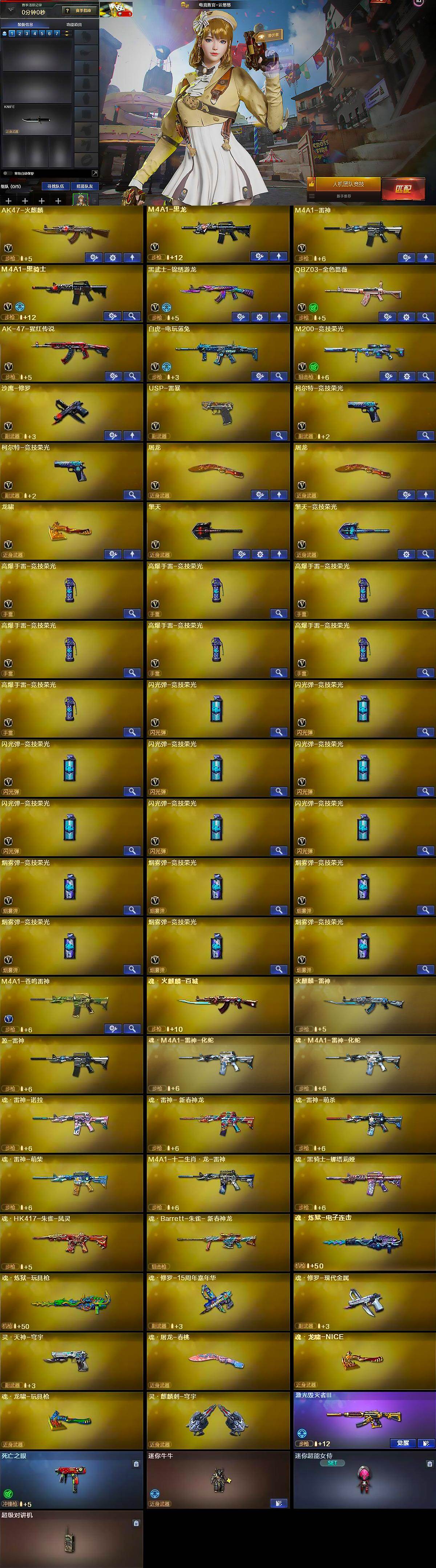 【道具】:战舰背包,炫彩背包,背包-洛丽塔,超级背包,救世主-黑桃战神,妩媚妖姬,绿色巨人,灵魂忍者*3,变异宝贝,妖姬,迷雾幽灵*2,生化弹匣,夺命之镰,防化服*3,金色流光-枪王排位,星辰流光-枪王排位,枪王排位28赛季金色流光,电玩兔兔表情,防弹头盔*8,防弹衣*8,C4工具钳*6,手雷包*6