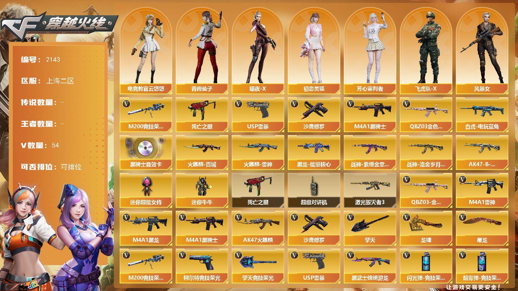 [16951673]上海二区-54V-0王者武器数-0炫金武器数 【热门武器】:QBZ03-金色蔷薇,M200-竞技荣光,死亡之眼,白虎-电玩蓝兔,M4A1-黑骑士,USP-雷暴,沙鹰-修罗 【音效卡】:M4A1-黑骑士音效卡 【皮肤】:火麒麟-雷神,火麒麟-百城,黑龙-能量核心,战神-紫绶金章皮肤,战神-流金岁月皮肤,AK47-B-常胜将军-刘备 【角色】:电竞教官-云悠悠,暗夜-X,初恋灵狐,芳心审判者,飞虎队-X,风暴女,嘉年华灵狐,娟娟,灵狐者-X,灵狐者-黄金海岸,灵狐者-七夕宝贝,龙儿-小淘气,潘多拉-X,潘多拉-甜心教官,青霞仙子,斯沃特-X,兔囡囡,维纳斯,新娜塔莎,夜玫瑰-宠粉,影武者-X,游珑儿 【人偶武器】:迷你牛牛,迷你超能女侍 【暴走生化】:死亡之眼,超级对讲机 【挑战大师】:激光毁灭者III 【英雄级武器】:AK47-火麒麟,M4A1-黑龙,M4A1-雷神,M4A1-黑骑士,黑武士-锦绣游龙,QBZ03-金色蔷薇,AK-47-猩红传说,白虎-电玩蓝兔,M200-竞技荣光,沙鹰-修罗,USP-雷暴,柯尔特-竞技荣光*2,屠龙*2,龙啸,擎天,擎天-竞技荣光,高爆手雷-竞技荣光*7,闪光弹-竞技荣光*8,烟雾弹-竞技荣光*6,M4A1-苍鸣雷神 【道具】:战舰背包,炫彩背包,背包-洛丽塔,超级背包,救世主-黑桃战神,妩媚妖姬,绿色巨人,灵魂忍者*3,变异宝贝,妖姬,迷雾幽灵*2,生化弹匣,夺命之镰,防化服*3,金色流光-枪王排位,星辰流光-枪王排位,枪王排位28赛季金色流光,电玩兔兔表情,防弹头盔*8,防弹衣*8,C4工具钳*6,手雷包*6 【特殊枪械】:1黑骑士