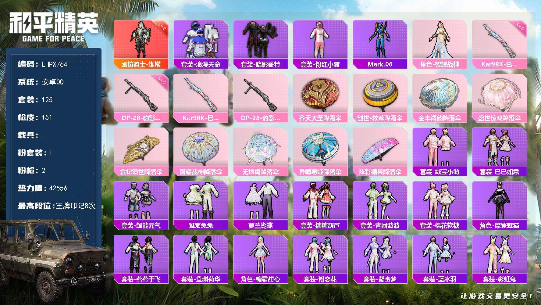 [16951690]【特价出售/店主推荐】安卓 手Q-1神装-1粉装-2特效枪-0载具-1粉色飞行器-42556热力值-8王牌印记-125套装-151枪皮