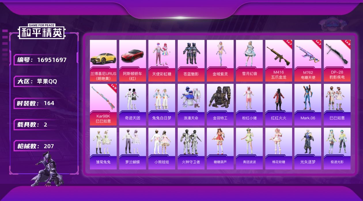 [16951697]【特价出售/店主推荐】苹果 手Q-4粉装-4特效枪-2载具-2粉色飞行器-66159热力值-12王牌印记-164套装-207枪皮
