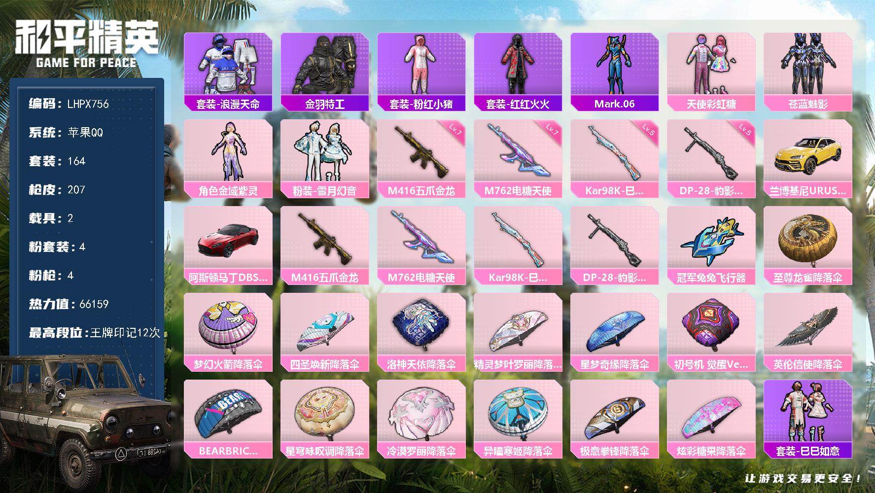 [16951697]【特价出售/店主推荐】苹果 手Q-4粉装-4特效枪-2载具-2粉色飞行器-66159热力值-12王牌印记-164套装-207枪皮 【热门品类】:套装-浪漫天命,套装-金羽特工,套装-粉红小猪,套装-红红火火,角色-Mark.06 【粉色套装】:粉装-天使彩虹糖,粉装-苍蓝魅影,角色-金域紫灵,粉装-雪月幻音 【粉色枪皮等级】:M416-五爪金龙(七级),M762-电糖天使(七级),Kar98K-巳巳如意(五级),DP-28-豹影疾电(五级) 【粉色载具】:兰博基尼URUS(明艳黄),阿斯顿马丁DBS(红) 【粉色枪皮】:M416-五爪金龙,M762-电糖天使,Kar98K-巳巳如意,DP-28-豹影疾电 【粉色飞行器】:冠军兔兔飞行器 【粉色降落伞】:至尊龙雀降落伞,梦幻火箭降落伞,四圣焕新降落伞,洛神天依降落伞,精灵梦叶罗丽降落伞,星梦奇缘降落伞,初号机 觉醒Ver.降落伞,英伦信使降落伞,BEARBRICK降落伞,星穹咏叹调降落伞,冷漠罗丽降落伞,异瞳寒姬降落伞,极意拳锋降落伞,炫彩糖果降落伞 【稀有套装】:套装-巳巳如意,套装-雪国风尚,套装-炫彩糖果,套装-雏菊兔兔,套装-萝兰蝴蝶,套装-小熊娃娃,套装-火种守卫者,套装-糖糖葫芦,套装-青团波波,套装-棉花软糖,角色-光矢逐梦,套装-极速光影,套装-彩虹兔,套装-云朵鹅,套装-雪绒豹,角色-灵公主,角色-玫纹锢梦 【稀有枪皮】:AUG-冰晶雪宝,AKM-春暖花开,AKM-灼热熔岩,AKM-萌趣颜团子,M16A4-幻世战舞者,M16A4-红色方程式,M16A4-蓝色火焰,SCAR-L-夜灯,SCAR-L-炫彩节奏,SCAR-L-玉兔迎春,SCAR-L-红色方程式,M416-仓鼠灰灰,GROZA-治愈之星,GROZA-生命誓言,GROZA-马卡龙,AUG-耀粉歌者,QBZ-原初圣火,QBZ-洛神天依,QBZ-神秘黑猫,M762-天降萌叽,M762-奇异狩猎者,M762-彩虹符号,M762-拳皇97,M762-牛气冲天,M762-镭射皇者,M762-云朵鹅,M762-登顶巅峰,Mk47-洛神天依,AC-VAL-天降萌叽,蜜獾-天降萌叽,蜜獾-娇憨猪猪,UZI-啾咪啾咪,UZI-娇憨猪猪,UZI-炫彩节奏,UMP45-夜灯,UMP45-蓝色火焰,Vector-PEL轰鸣竞梦者,Vector-彩虹符号,Vector