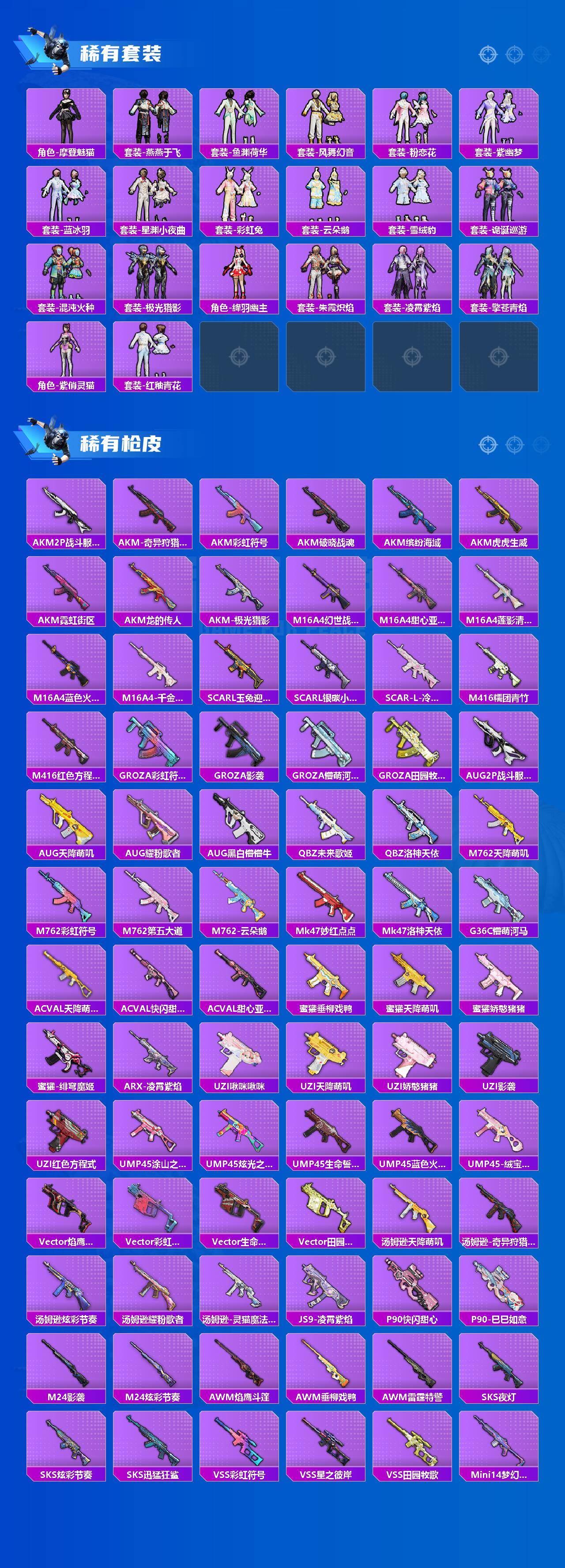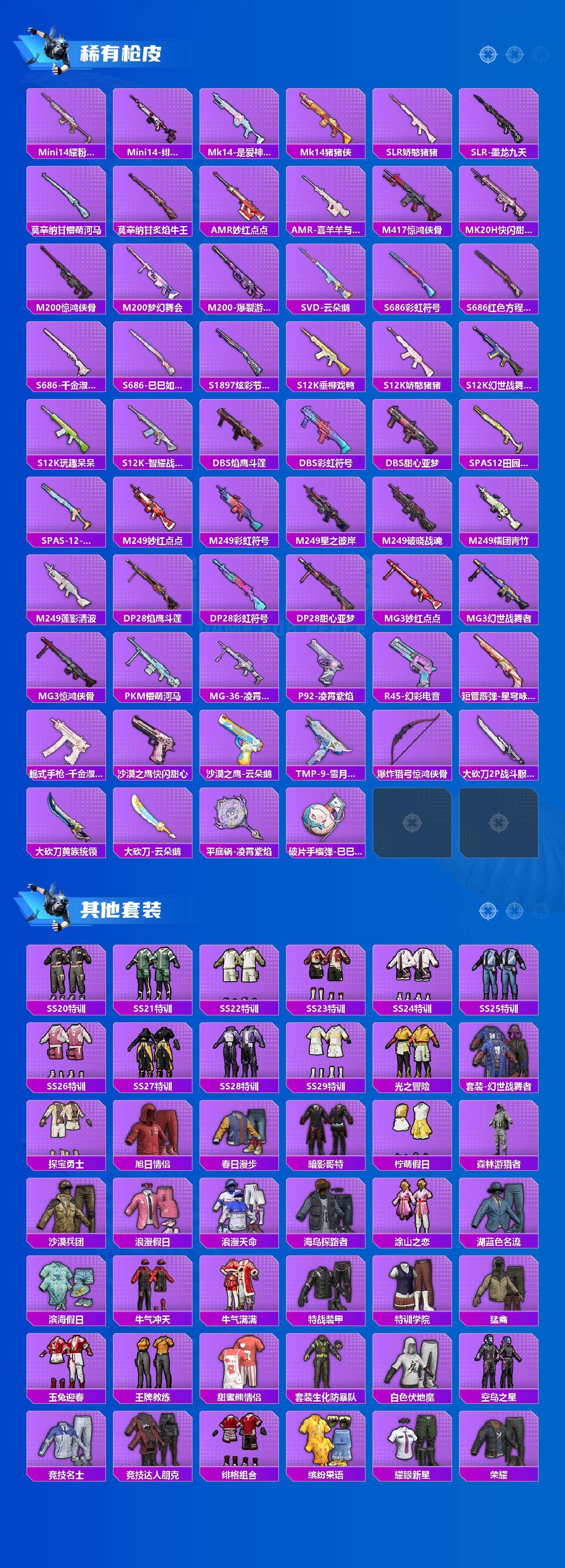 - [15229179]【暑期末清货/特价急出/永久包赔/商品详情看图】:有二次/超多王者武器/三国武器/4英雄角色数-173英雄武器数 【王者系列】:王者之翼,王者之击,王者之戮,王者之心,王者之神,王者之啸 【热门武器】:M4A1-武圣,AK47-游骑兵,M4A1-游骑兵,81式-阿波罗,COP 357-青龙,COP 357-绚樱 【英雄武器】:AK47-樱斗士-二觉,AK47-猩红传说,AK47-沙漠郡主-超觉,AK47-冰魂,AK47-游骑兵,AK47-无影,AK47-沙漠领主,AK47-沙漠领主,AK47-变色龙,AK47-沙漠郡主-一觉,AK47-血武士,AK47-幸运日,M4A1-龙血,M4A1-君威GS,M4A1-君威GS,M4A1-武圣,M4A1-游骑兵,M4A1-海骑士,SCAR-探星者,SCAR-印刷术,AN94-超新星,AUG-机械纪元,QBZ03-湮灭,QBZ03-湮灭,剑齿虎-炫彩,AWM-裁决,巴雷特-枪娘,M200-心动次元觉醒,98K-黑骑士,RPK-赤炎盘龙,加特林-堡垒,加特林-堡垒,刘易斯-血月,QBB95-极光,MK5-机械纪元,MK5-机械纪元,汤姆逊-烈龙,汤姆逊-烈龙,汤姆逊-烈龙,汤姆逊-烈龙,双持斯泰尔-天使,QCW05-死神,QCW05-变形金刚·大黄蜂,CZS2-心动次元,PP19野牛-造纸术,地狱烈炎,KSG-火力竞放,地狱火,USP-神罚,USP-神罚,USP-神罚,USP-神罚,USP-神罚,沙鹰-波塞冬,沙鹰-火麒麟,沙鹰-天神,左轮-黑武士觉醒,蟒蛇-火力竞放,GLOCK18-武圣,QSZ92-华夏传说,双管猎枪-黑骑士,柯尔特-伏刹山海觉醒,激光短刃-黑骑士,墨刃-幻神,尼泊尔-火麒麟,麒麟刺,麒麟刺,麒麟刺,擎天觉醒,秋逸觉醒,擎天,擎天,神罚战斧,星芒,星芒,血阳,血阳,耀金雷刃,斩魔剑-天使,斩魔刀,丈八蛇矛 【其他武器】:玫瑰精灵,玫瑰精灵 【角色】:零,葵,关小雨,关小雨 【万化皮肤】:王者之锋-冰霜奇迹