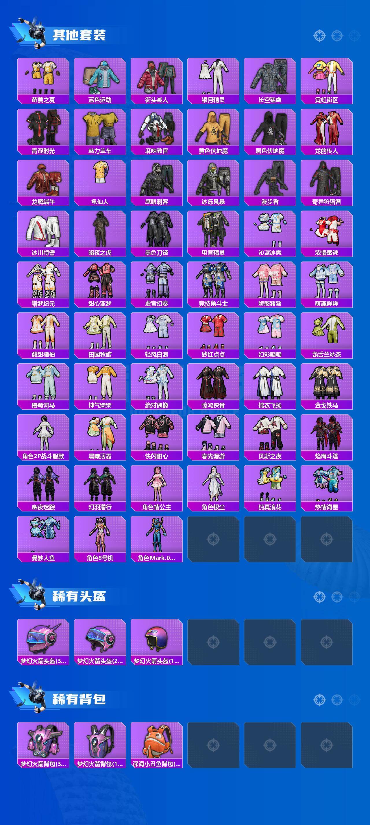 - [17081114]安卓 手Q-3粉装-5特效枪-0载具-2粉色飞行器-19901热力值-2王牌印记-39套装-66枪皮 【热门品类】:套装-奇异狩猎者 【粉色套装】:角色-花灵,角色-异瞳寒姬,粉装-极意拳锋 【粉色枪皮等级】:蜜獾-异瞳寒姬(四级),ARX-无垠阁(五级),DP-28-豹影疾电(五级) 【粉色枪皮】:蜜獾-异瞳寒姬,ARX-无垠阁,UMP45-萌骑冒险,Mk14-福马献瑞,DP-28-豹影疾电 【粉色飞行器】:炫彩糖果飞行器,极意拳锋飞行器 【粉色降落伞】:春暖花开降落伞,无垠阁降落伞,异瞳寒姬降落伞,炫彩糖果降落伞,罪夜之冕降落伞 【稀有套装】:套装-炫彩糖果,套装-云朵鹅,套装-雪绒豹,角色-时希公主,角色-绯色魅影,套装-画境星梦,套装-琴音绮想,角色-碧青流霞 【稀有枪皮】:AKM-奇异狩猎者,M16A4-幻世战舞者,M762-奇异狩猎者,M762-甜心宝贝,M762-镜中幻,M762-云朵鹅,Mk47-虹云熊熊,ACE32-画境星梦,UZI-红色方程式,Vector-彩虹符号,汤姆逊-奇异狩猎者,MP5K-画境星梦,M24-奇异狩猎者,Mini14-耀粉歌者,SVD-云朵鹅,M1加兰德-画境星梦,S686-奇异狩猎者,S686-生命誓言,S686-千金淑猫,S1897-炫彩节奏,AA12-G-画境星梦,SPAS-12-云朵鹅,M249-彩虹符号,M249-糯团青竹,MG3-幻世战舞者,短管霰弹-星穹咏叹调,沙漠之鹰-云朵鹅,爆炸猎弓-喜羊羊与灰太狼,大砍刀-云朵鹅,平底锅-无垠阁,平底锅-画境星梦 【其他套装】:套装-柠萌假日,套装-特殊使命,套装-疯狂小兔子,套装-蓝彩潮人,套装-街头潮人,套装-金鼠迎春,套装-魅力单车,套装-黄色运动,套装-奇异狩猎者,套装-金耀舞者,套装-蓝调潮人,套装-贵族骑装 【稀有头盔】:梦幻火箭头盔(1级) 【稀有背包】:火曜朱雀背包(3级),火曜朱雀背包(2级),火曜朱雀背包(1级) 【营地ID】:1033143176
