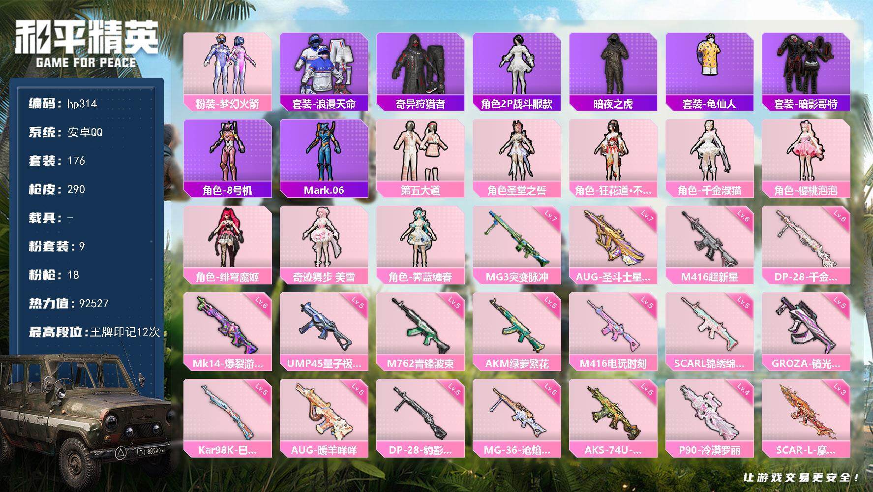 [16952262]安卓 手Q-9粉装-18特效枪-0载具-6粉色飞行器-92527热力值-12王牌印记-176套装-290枪皮