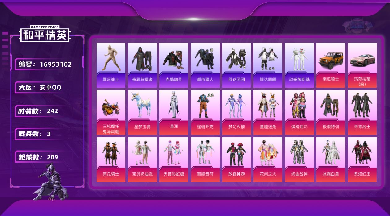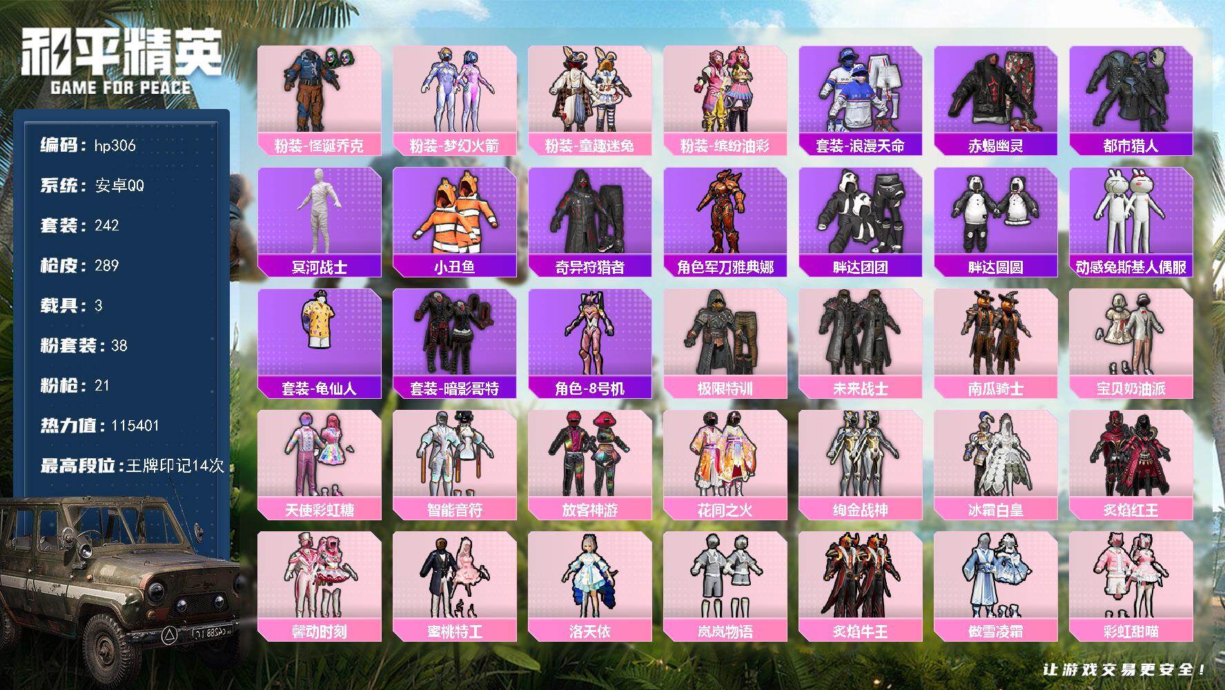 [16953102]安卓 手Q-38粉装-21特效枪-3载具-4粉色飞行器-115401热力值-14王牌印记-242套装-289枪皮