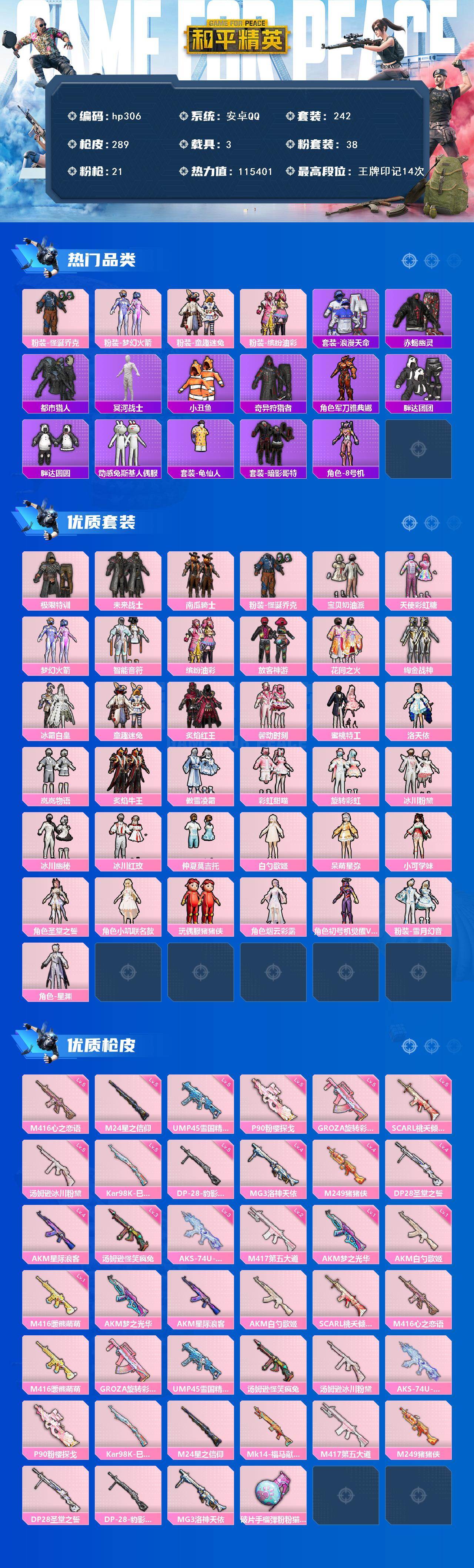 [16953102]安卓 手Q-38粉装-21特效枪-3载具-4粉色飞行器-115401热力值-14王牌印记-242套装-289枪皮 【热门品类】:粉装-怪诞乔克,粉装-梦幻火箭,粉装-童趣迷兔,粉装-缤纷油彩,套装-浪漫天命,套装-赤蝎幽灵,套装-都市猎人,套装-冥河战士,套装-小丑鱼,套装-奇异狩猎者,角色-军刀雅典娜,套装-胖达团团,套装-胖达圆圆,套装-动感兔斯基人偶服,套装-龟仙人,套装-暗影哥特,角色-8号机 【粉色套装】:粉装-极限特训,粉装-未来战士,粉装-南瓜骑士,粉装-怪诞乔克,粉装-宝贝奶油派,粉装-天使彩虹糖,粉装-梦幻火箭,粉装-智能音符,粉装-缤纷油彩,粉装-放客神游,粉装-花间之火,粉装-绚金战神,粉装-冰霜白皇,粉装-童趣迷兔,粉装-炙焰红王,粉装-馨动时刻,粉装-蜜桃特工,角色-洛天依,粉装-岚岚物语,粉装-炙焰牛王,粉装-傲雪凌霜,粉装-彩虹甜喵,粉装-旋转彩虹,粉装-冰川粉黛,粉装-冰川幽秘,粉装-冰川红玫,粉装-仲夏莫吉托,角色-白勺歌姬,角色-呆萌星弥,角色-小可学妹,角色-圣堂之誓,角色-小叽联名款,玩偶服-猪猪侠,角色-烟云彩露,角色-初号机 觉醒Ver.,粉装-雪月幻音,角色-星渊 【粉色枪皮等级】:AKM-梦之光华(一级),AKM-星际浪客(四级),AKM-白勺歌姬(一级),SCAR-L-桃夭倾城(五级),M416-心之恋语(五级),M416-暖熊萌萌(一级),GROZA-旋转彩虹(五级),UMP45-雪国精灵(五级),汤姆逊-怪笑疯兔(三级),汤姆逊-冰川粉黛(五级),AKS-74U-无垠阁(三级),P90-粉樱探戈(五级),Kar98K-巳巳如意(五级),M24-星之信仰(五级),M417-第五大道(二级),M249-猪猪侠(四级),DP-28-圣堂之誓(四级),DP-28-豹影疾电(五级),MG3-洛神天依(四级) 【粉色载具】:玛莎拉蒂Ghibli(粉),鬼马风驰,星梦玉骢 【粉色枪皮】:AKM-梦之光华,AKM-星际浪客,AKM-白勺歌姬,SCAR-L-桃夭倾城,M416-心之恋语,M416-暖熊萌萌,GROZA-旋转彩虹,UMP45-雪国精灵,汤姆逊-怪笑疯兔,汤姆逊-冰川粉黛,AKS-74U-无垠阁,P90-粉樱探戈,Kar98K-巳巳如意,M24-星之信仰,Mk14-福马献瑞,M417-第五大道,M249-猪猪侠,DP
