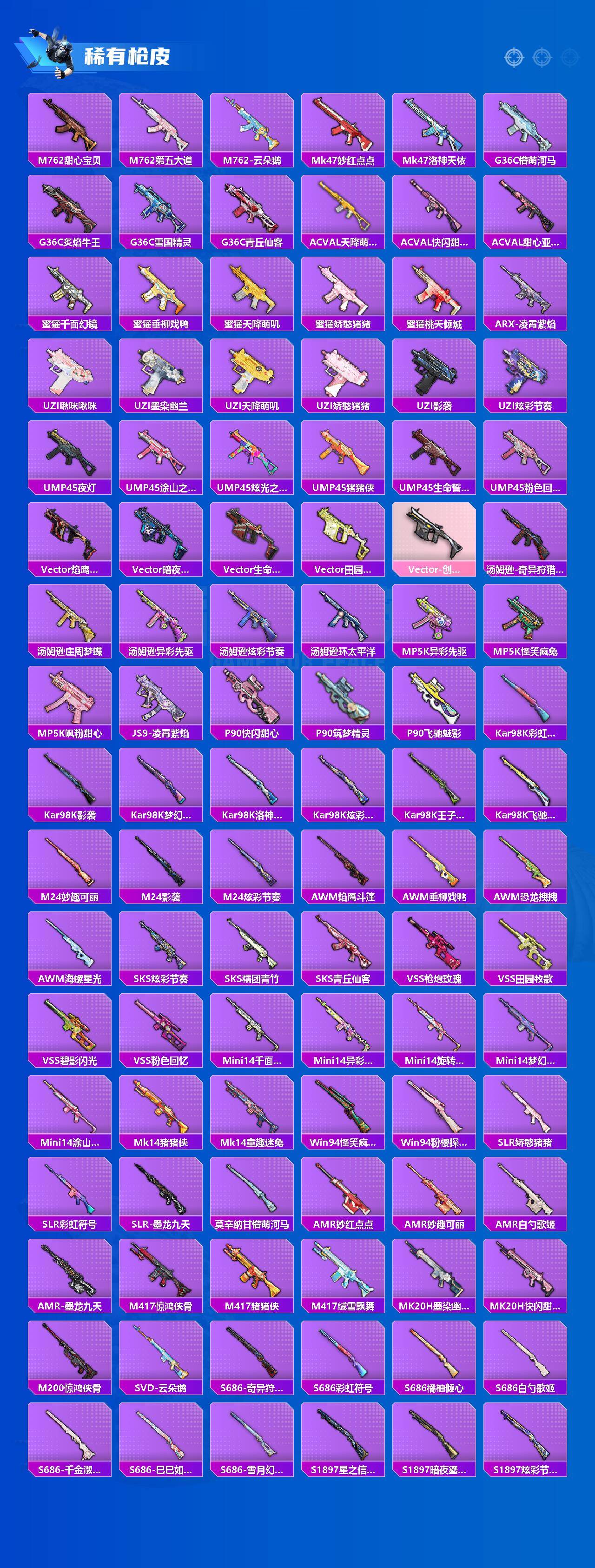 【粉色枪皮】:AKM-梦之光华,AKM-星际浪客,AKM-白勺歌姬,SCAR-L-桃夭倾城,M416-心之恋语,M416-暖熊萌萌,GROZA-旋转彩虹,UMP45-雪国精灵,汤姆逊-怪笑疯兔,汤姆逊-冰川粉黛,AKS-74U-无垠阁,P90-粉樱探戈,Kar98K-巳巳如意,M24-星之信仰,Mk14-福马献瑞,M417-第五大道,M249-猪猪侠,DP