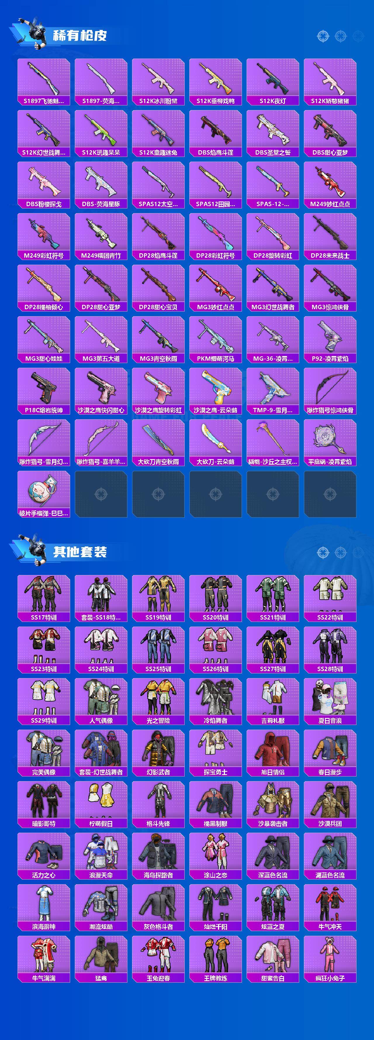 AKM-梦之光华,AKM-星际浪客,AKM-白勺歌姬,SCAR-L-桃夭倾城,M416-心之恋语,M416-暖熊萌萌,GROZA-旋转彩虹,UMP45-雪国精灵,汤姆逊-怪笑疯兔,汤姆逊-冰川粉黛,P90-粉樱探戈,Kar98K-巳巳如意,M24-星之信仰,M417-第五大道,M249-猪猪侠,DP-28-圣堂之誓,MG3-洛神天依,破片手榴弹-粉粉猫爪
