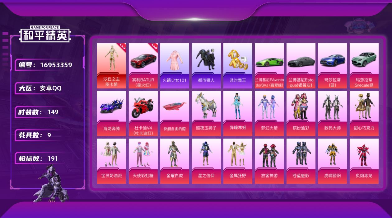 [16953359]安卓 手Q-1神装-26粉装-10特效枪-9载具-4粉色飞行器-93547热力值-3王牌印记-149套装-191枪皮