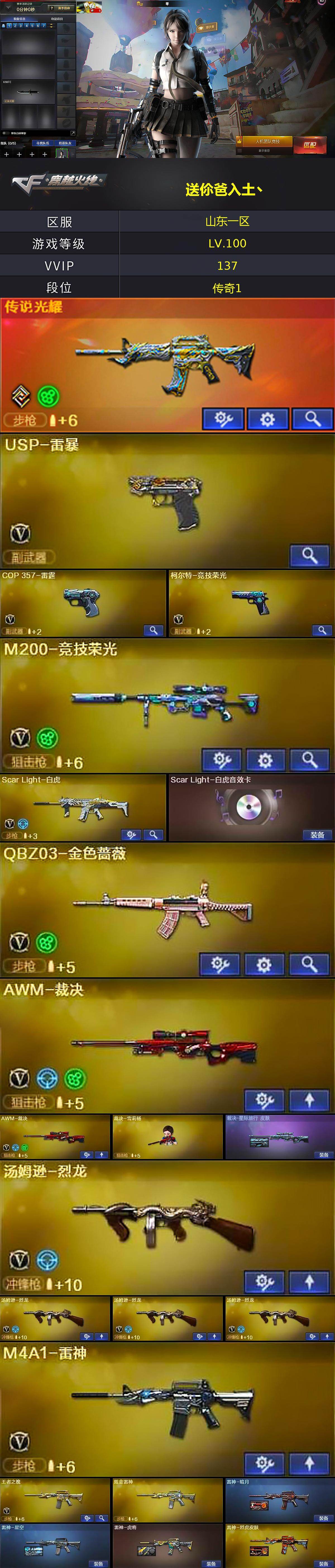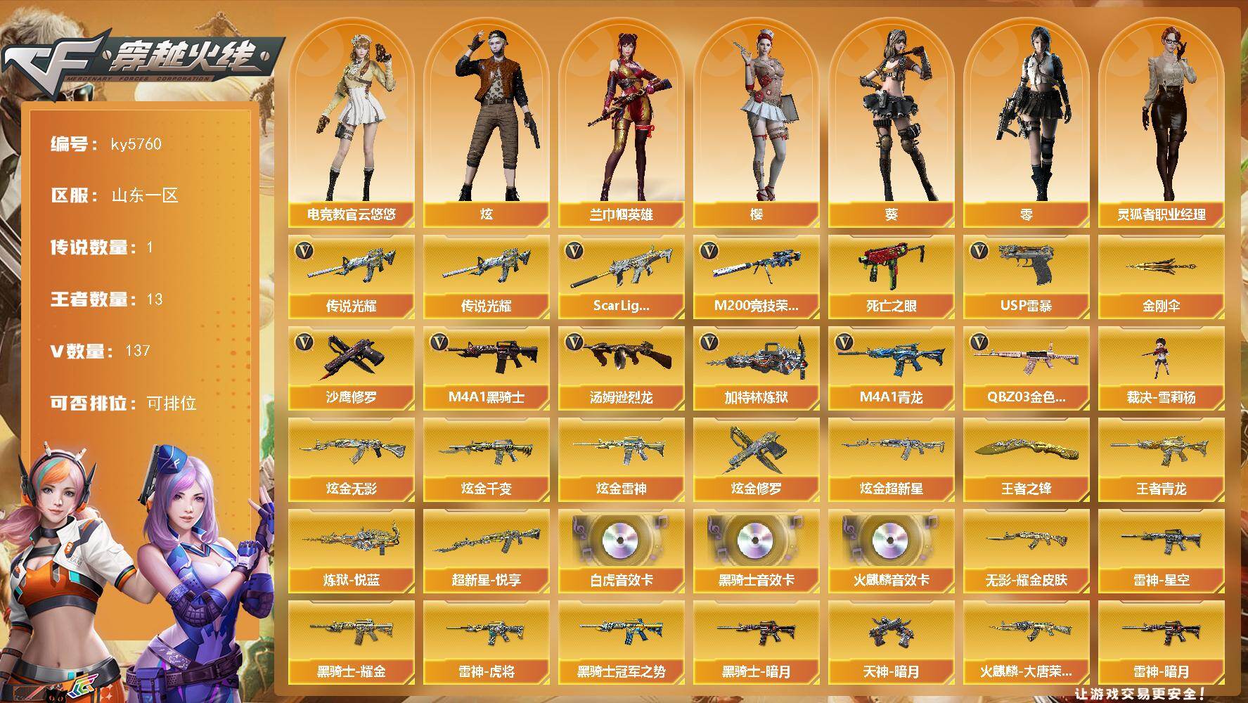 [16848260]山东一区-144V-13王者武器数-5炫金武器数 【传说武器】:传说光耀 【热门武器】:传说光耀,QBZ03-金色蔷薇,Scar Light-白虎,M4A1-青龙,M200-竞技荣光,死亡之眼*2,M4A1-黑骑士,汤姆逊-烈龙*4,加特林-炼狱*3,裁决-雪莉杨,USP-雷暴,沙鹰-修罗*2,金刚伞 【王者炫金武器】:超新星-悦享,王者青龙,炼狱-悦蓝*3,王者之锋*2,炫金无影,炫金千变,炫金雷神,炫金超新星,炫金修罗 【音效卡】:AK47-火麒麟音效卡,M4A1-黑骑士音效卡,Scar Light-白虎音效卡 【皮肤】:裁决-星际旅行 皮肤,雷神-暗月,雷神-星空,雷神-虎将,雷神-烈虎皮肤,火麒麟-大唐荣光,毁灭-英雄计划 皮肤,M4A1-千变-孔明皮肤,黑龙-能量核心,黑龙-暗月,黑骑士-暗月,黑骑士耀金皮肤,黑骑士-冠军之势,无影-能量核心,无影耀金皮肤,死神-秘银,天启-暗月,极光-能量核心,修罗-能量核心*3,天神-暗月 【角色】:零,葵,樱,炫,电竞教官-云悠悠,兰-巾帼英雄,乔伊教练,云海玲珑,风暴女,虎妞,嘉年华灵狐,葵-赛博朋克,灵狐者-职业经理,萌儿,兔囡囡,雪莉杨-摸金校尉,影武者-X 【人偶武器】:裁决-雪莉杨,迷你钢铁终结者,迷你地狱终结者,AWM-灵狐-15周年嘉年华,COP-旗袍 【暴走生化】:死亡之眼*2 【挑战大师】:冰龙粉碎者-白马银枪,激光毁灭者III,神圣爆裂者-末日III 【英雄级武器】:M4A1-千变*2,AK47-火麒麟*2,M4A1-黑龙*2,M4A1-雷神,M4A1-黑骑士,AK47-无影,M4A1-死神*2,AK47-黑武士,AK12-天启,AN94-超新星,M4A1-武圣,AK47-机械迷城,AK47-黑鲨*2,M4A1-龙血,M4A1-雷霆,M4A1-青龙,Scar Light-白虎,M4A1-神工天巧,无影-神兵利器,黑武士-锦绣游龙,M4A1-玫瑰精灵,QBZ03-金色蔷薇,M4A1-猎神,王者之心-觉醒版,王者之武-觉醒版,王者之魄-觉醒版,王者之戮-觉醒版,王者之幻-觉醒版,王者风势-觉醒版,AWM-天龙*3,Barrett-毁灭*3,Barrett-极光*2,AWM-裁决*2,M200-竞技荣光,加特林-炼狱*3,汤姆逊-烈龙*4,沙鹰-修罗*2,沙鹰-天神*2,USP-雷暴,COP-雷霆,柯
