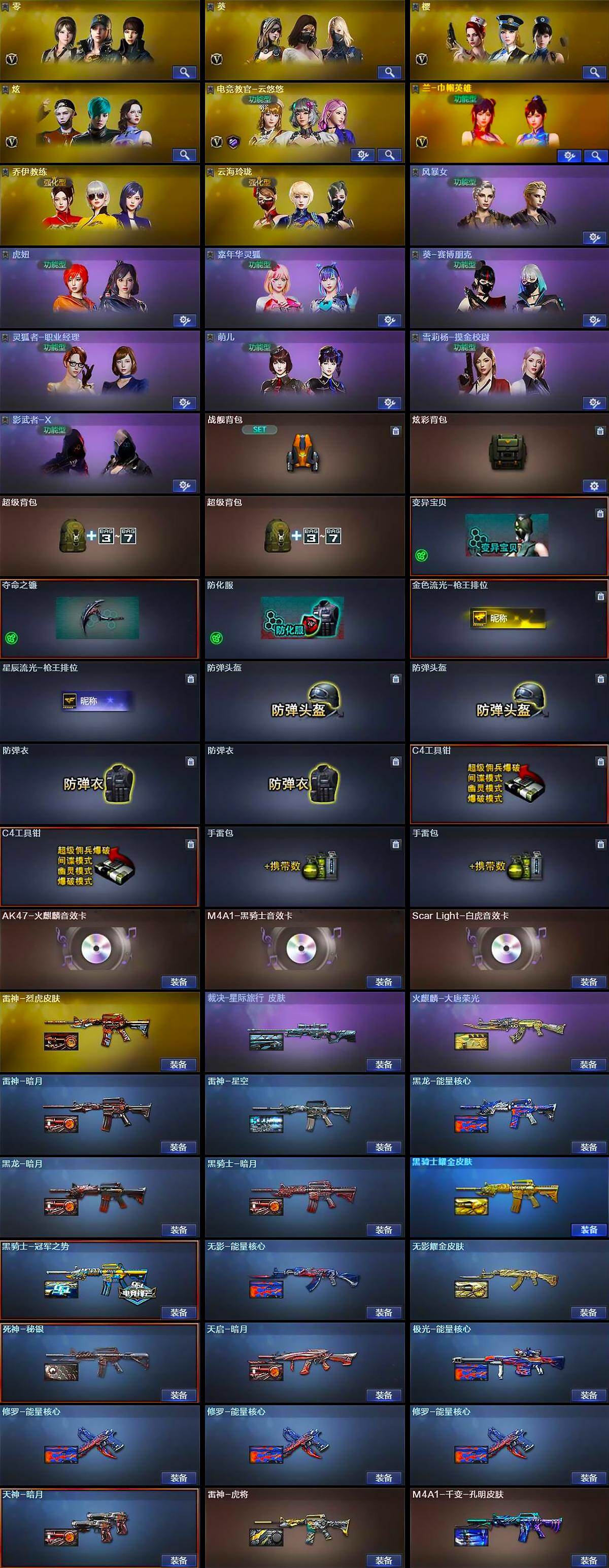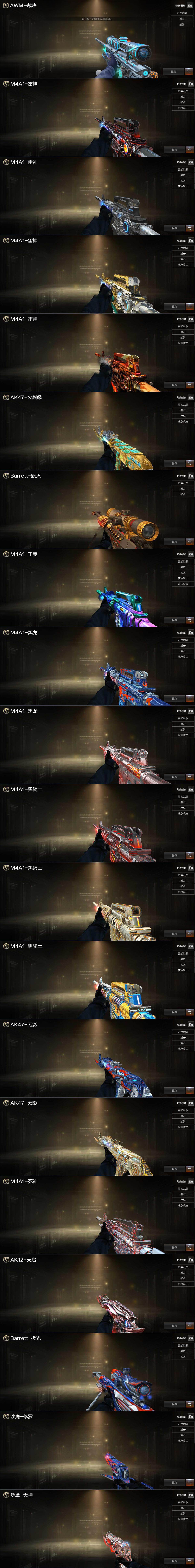 【英雄级武器】:M4A1-千变*2,AK47-火麒麟*2,M4A1-黑龙*2,M4A1-雷神,M4A1-黑骑士,AK47-无影,M4A1-死神*2,AK47-黑武士,AK12-天启,AN94-超新星,M4A1-武圣,AK47-机械迷城,AK47-黑鲨*2,M4A1-龙血,M4A1-雷霆,M4A1-青龙,Scar Light-白虎,M4A1-神工天巧,无影-神兵利器,黑武士-锦绣游龙,M4A1-玫瑰精灵,QBZ03-金色蔷薇,M4A1-猎神,王者之心-觉醒版,王者之武-觉醒版,王者之魄-觉醒版,王者之戮-觉醒版,王者之幻-觉醒版,王者风势-觉醒版,AWM-天龙*3,Barrett-毁灭*3,Barrett-极光*2,AWM-裁决*2,M200-竞技荣光,加特林-炼狱*3,汤姆逊-烈龙*4,沙鹰-修罗*2,沙鹰-天神*2,USP-雷暴,COP-雷霆,柯