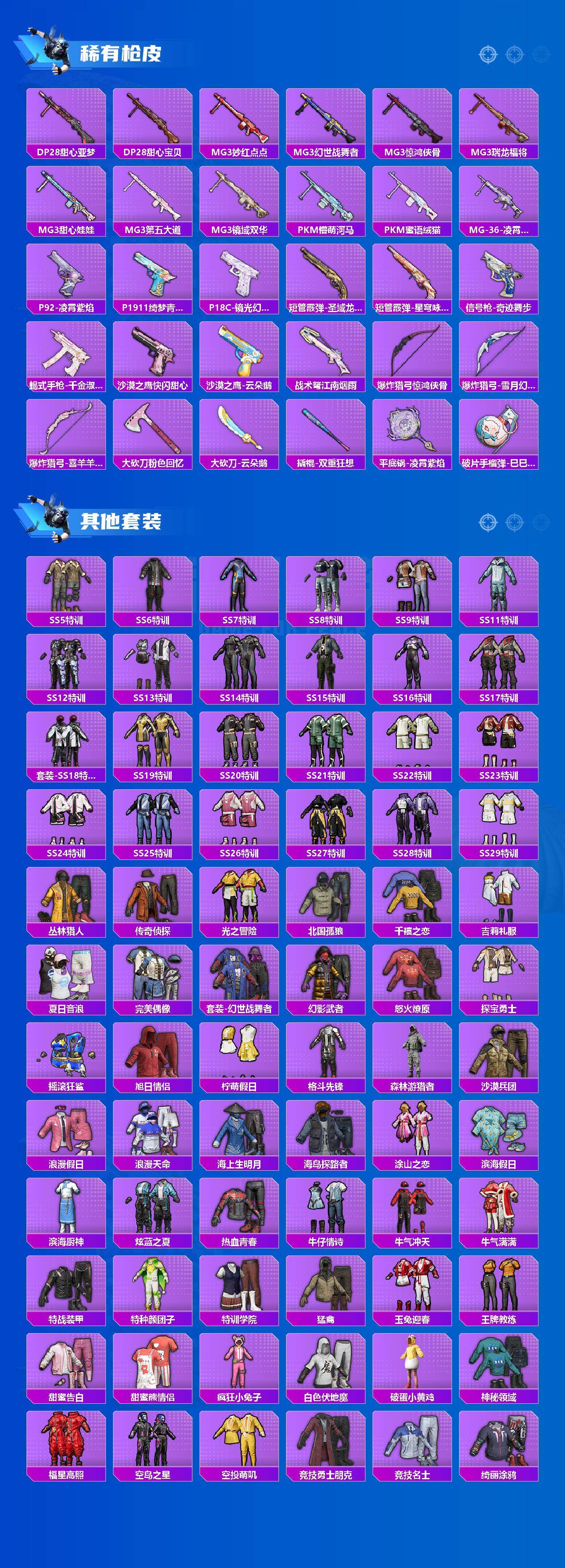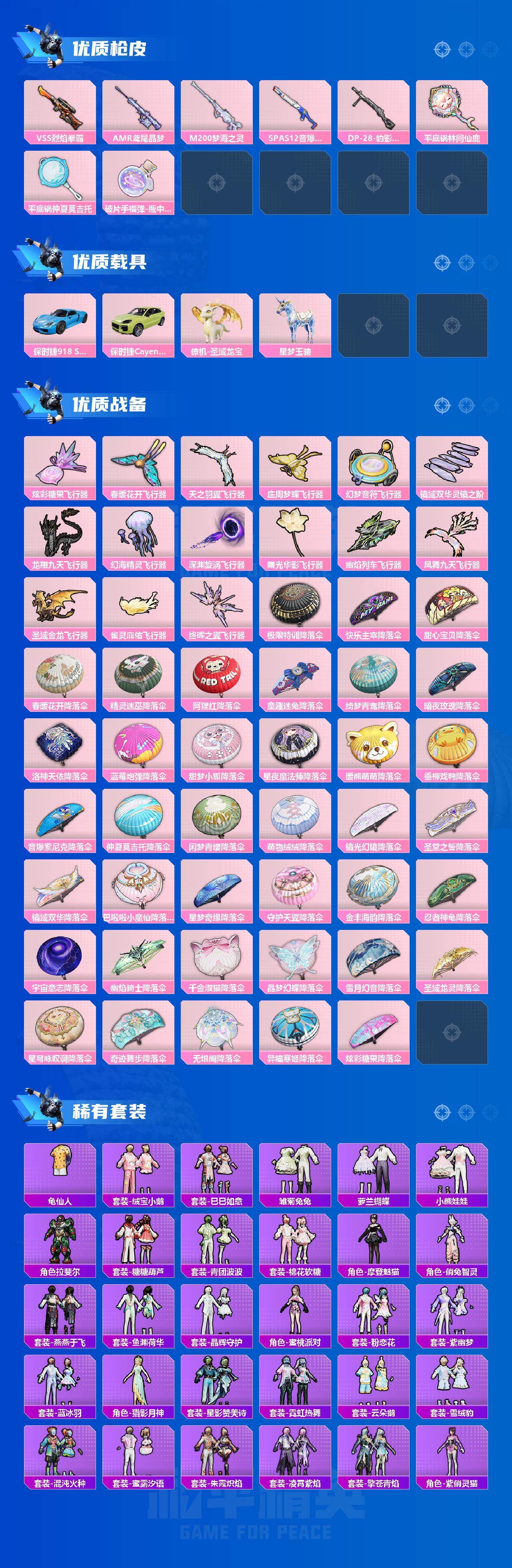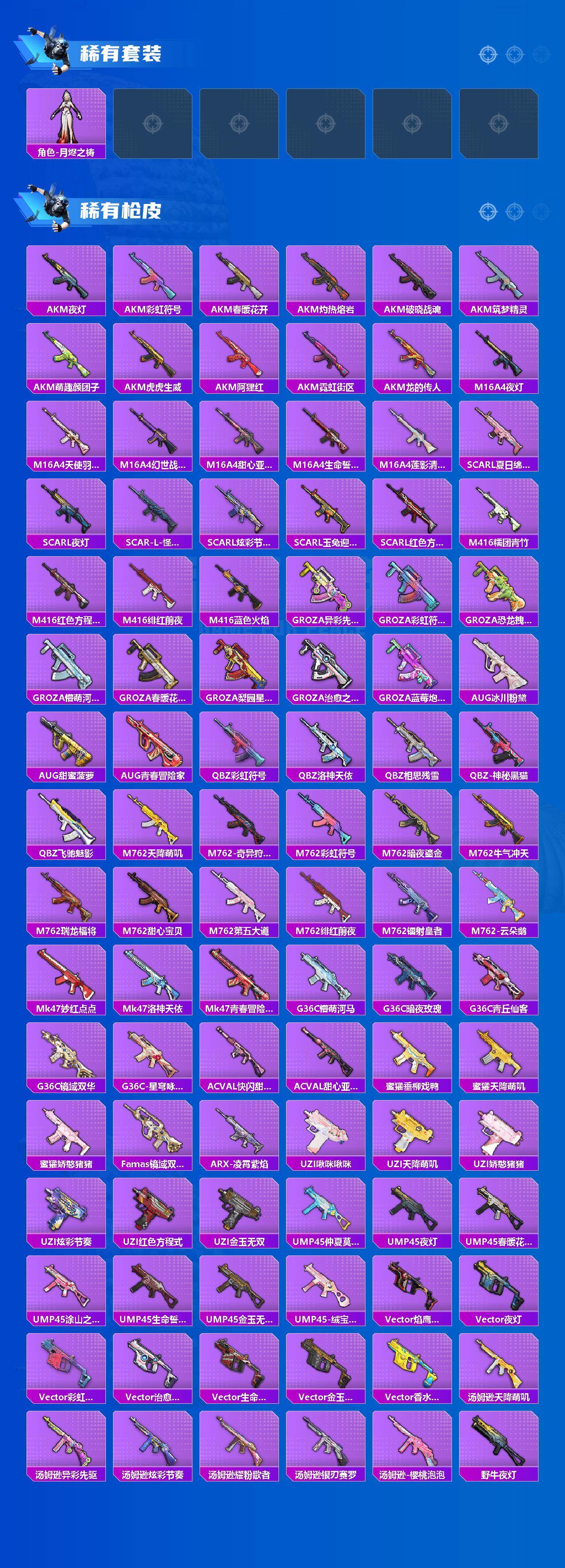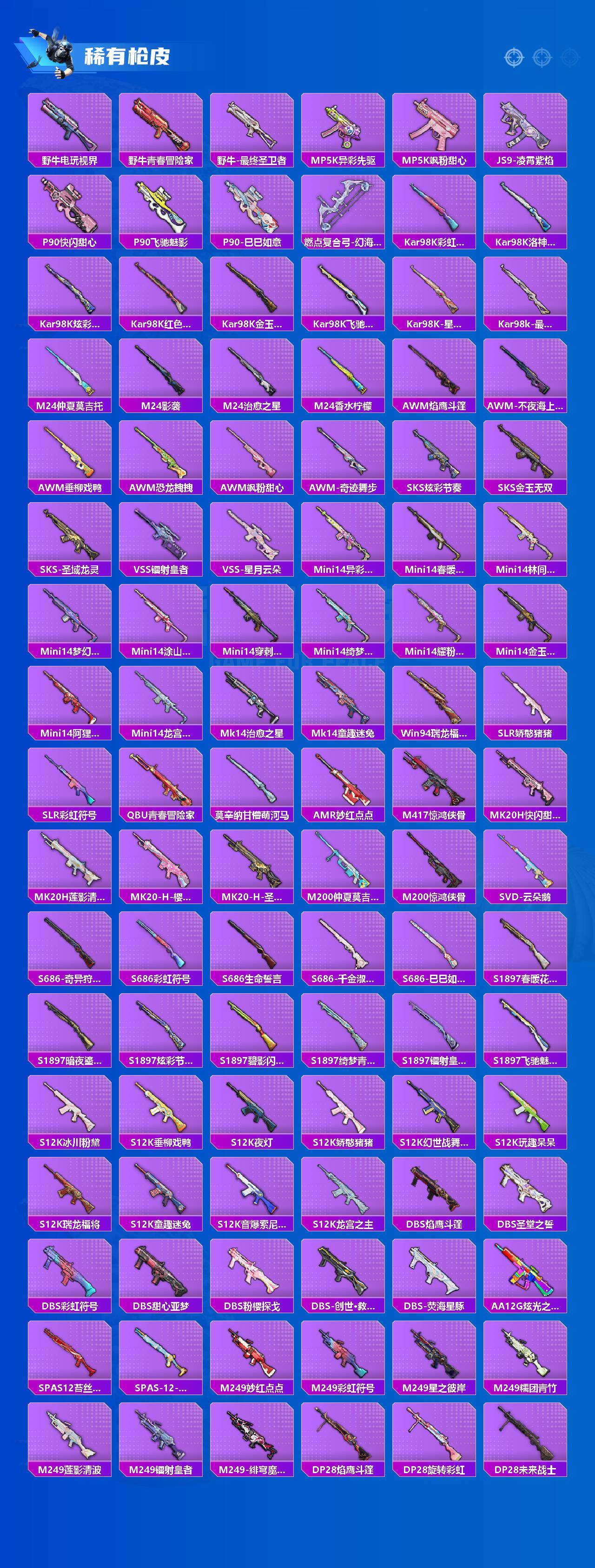AKM-炫紫旋律,AKM-白勺歌姬,AKM-幽焰骑士,SCAR-L-甜梦小狐,SCAR-L-锦绣绵绵,M416-心之恋语,GROZA-巴啦啦小魔仙,AUG-星梦奇缘,P90-甜蜜草莓,P90-金丰海韵,Kar98K-巳巳如意,Kar98K-圣域龙灵,VSS-烈焰拳霸,AMR-鸢尾晶梦,M200-梦海之灵,SPAS-12-音爆索尼克,平底锅-林间仙鹿,平底锅-仲夏莫吉托