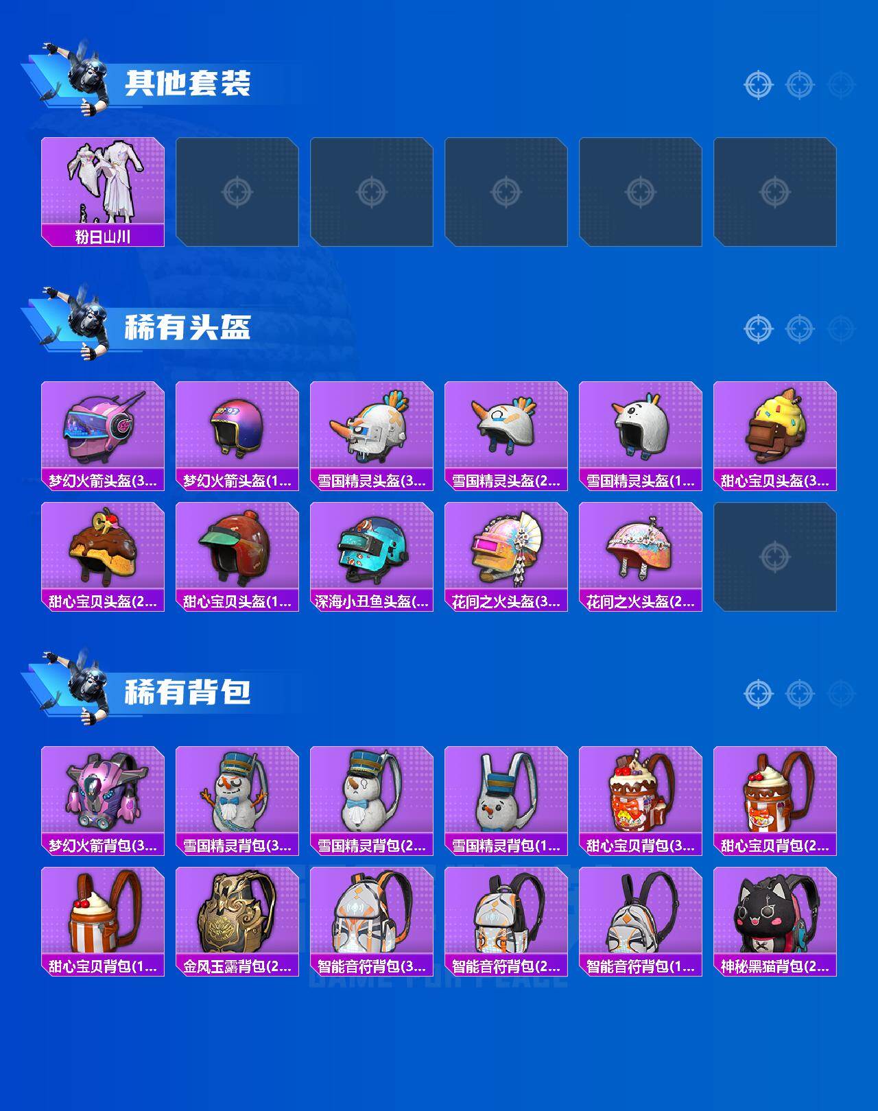 【粉色枪皮等级】:AKM-炫紫旋律(三级),AKM-白勺歌姬(六级),AKM-幽焰骑士(三级),SCAR-L-甜梦小狐(四级),SCAR-L-锦绣绵绵(五级),M416-心之恋语(四级),M416-灵猫魔法师(九级),GROZA-巴啦啦小魔仙(七级),AUG-星梦奇缘(六级),AKS-74U-星穹咏叹调(四级),P90-甜蜜草莓(五级),P90-金丰海韵(一级),Kar98K-巳巳如意(五级),Kar98K-圣域龙灵(三级),VSS-烈焰拳霸(五级),AMR-鸢尾晶梦(四级),M200-梦海之灵(三级),SPAS-12-音爆索尼克(四级),DP-28-豹影疾电(五级),平底锅-林间仙鹿(三级),平底锅-仲夏莫吉托(一级),破片手榴弹-瓶中星球(六级)