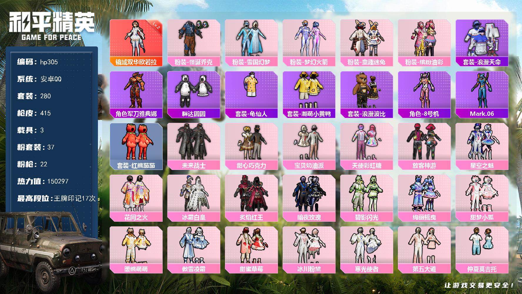 [16953418]安卓 手Q-1神装-37粉装-22特效枪-3载具-16粉色飞行器-150297热力值-17王牌印记-280套装-415枪皮