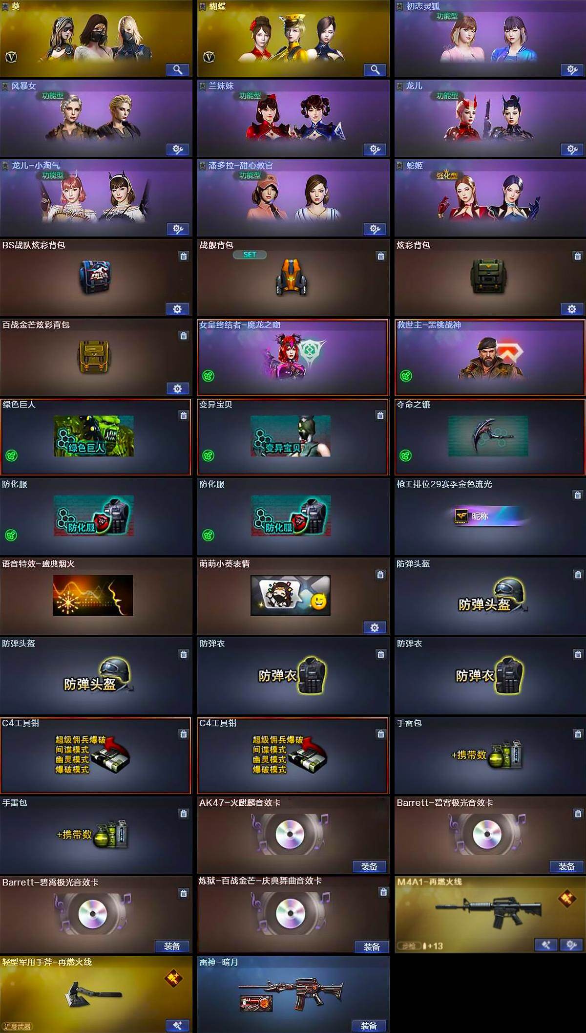 【道具】:BS战队炫彩背包,战舰背包,炫彩背包,百战金芒炫彩背包,女皇终结者-魔龙之吻,救世主-黑桃战神,绿色巨人,变异宝贝,夺命之镰,防化服*2,枪王排位29赛季金色流光,语音特效-盛典烟火,萌萌小葵表情,防弹头盔*2,防弹衣*2,C4工具钳*2,手雷包*2