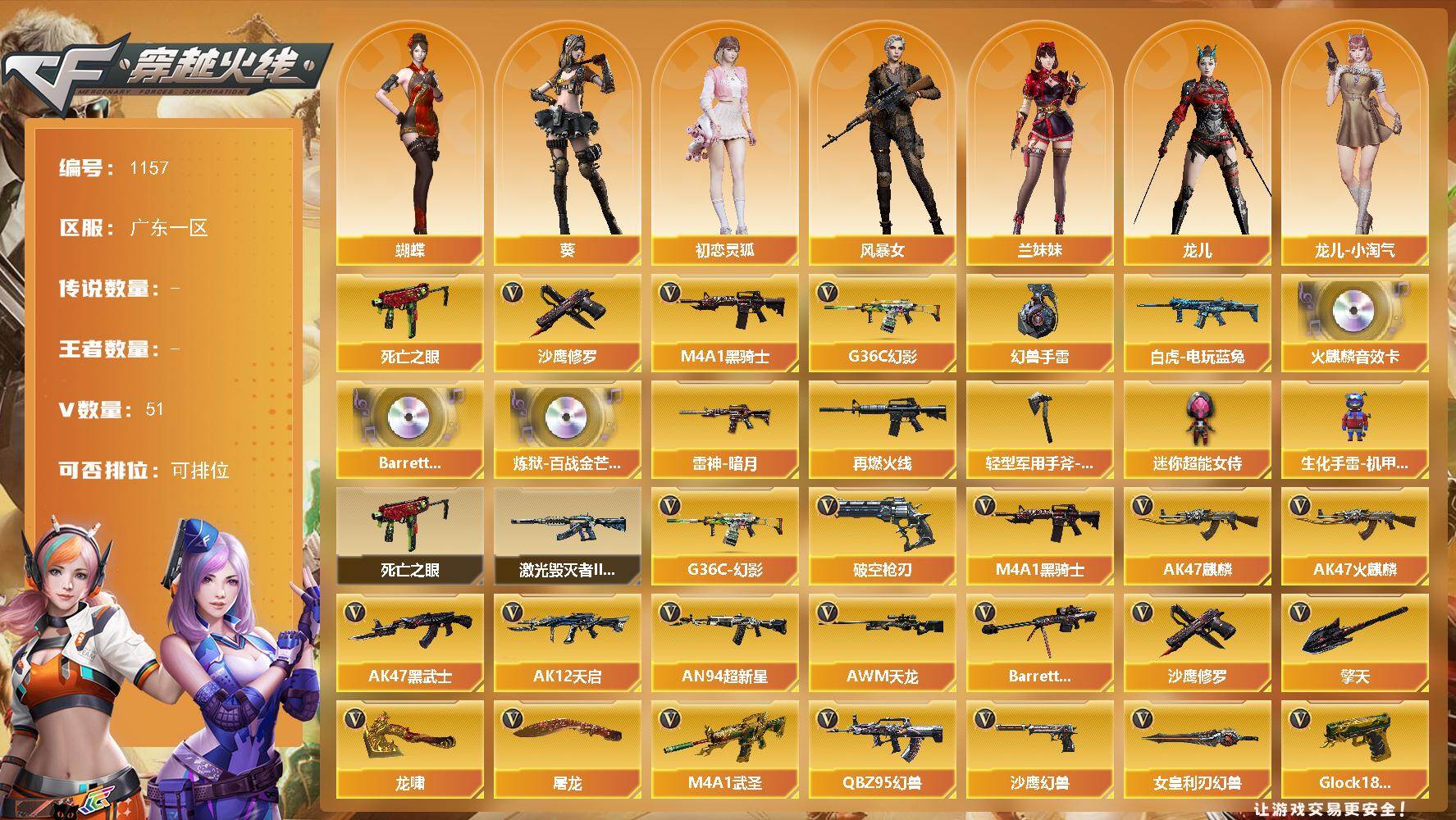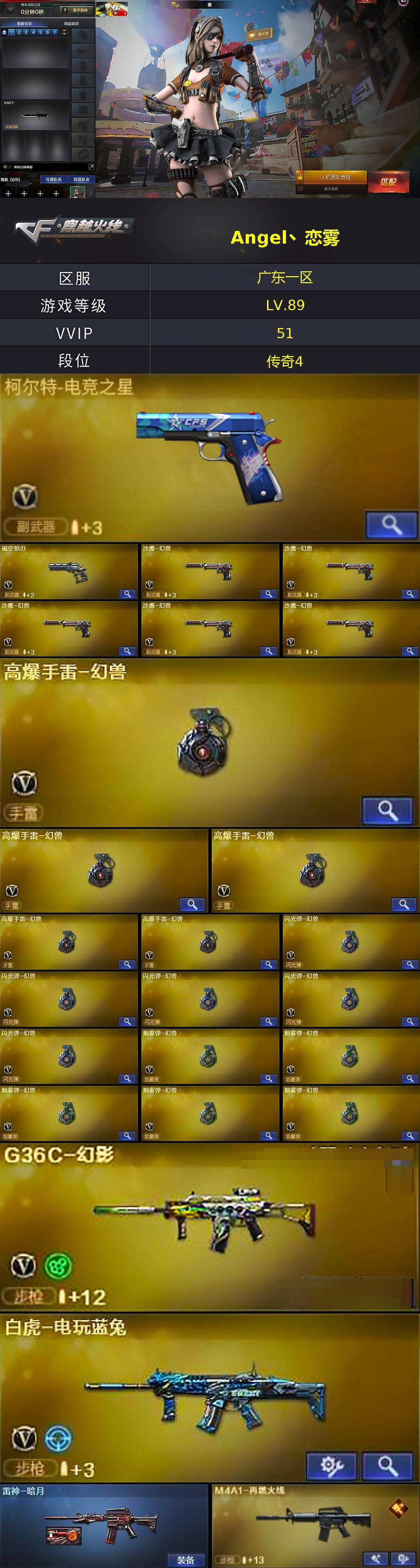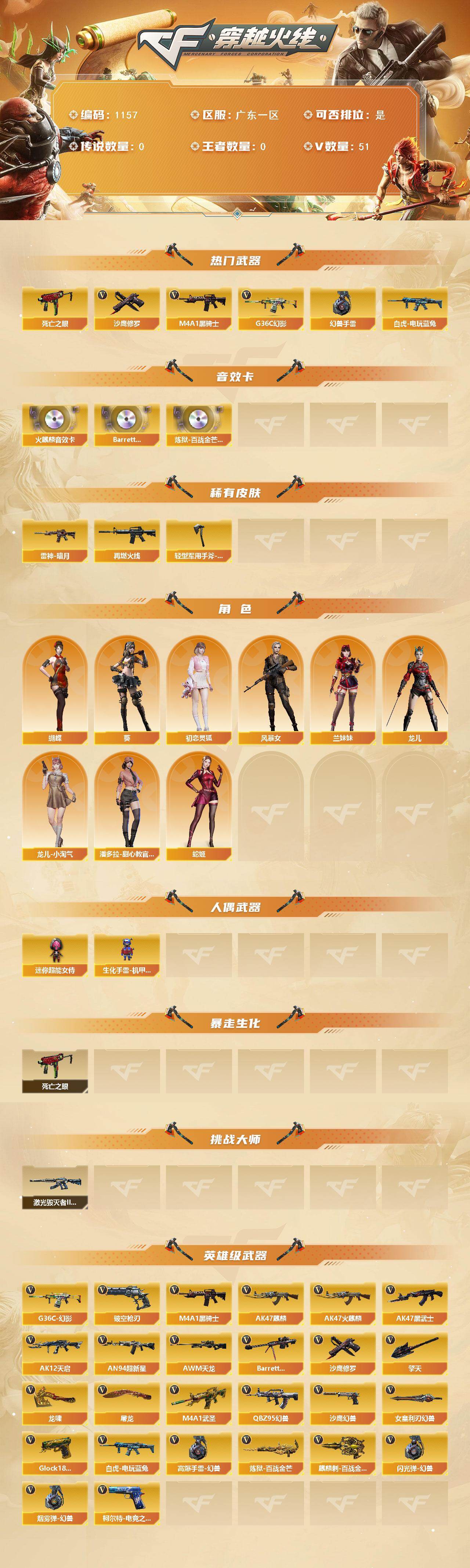 [16682259]广东一区-52V-0王者武器数-0炫金武器数 【热门武器】:G36C-幻影,死亡之眼,白虎-电玩蓝兔,M4A1-黑骑士,沙鹰-修罗,高爆手雷-幻兽*5 【音效卡】:AK47-火麒麟音效卡,Barrett-碧霄极光音效卡*2,炼狱-百战金芒-庆典舞曲音效卡 【皮肤】:雷神-暗月,M4A1-再燃火线,轻型军用手斧-再燃火线 【角色】:葵,蝴蝶,初恋灵狐,风暴女,兰妹妹,龙儿,龙儿-小淘气,潘多拉-甜心教官,蛇姬 【人偶武器】:生化手雷-机甲核心*2,迷你超能女侍 【暴走生化】:死亡之眼 【挑战大师】:激光毁灭者III-白马银枪 【英雄级武器】:AK47-火麒麟,AK47-麒麟,M4A1-黑骑士,AK47-黑武士,AK12-天启,AN94-超新星,M4A1-武圣,G36C-幻影,QBZ95-幻兽,白虎-电玩蓝兔,AWM-天龙,Barrett-毁灭,炼狱-百战金芒,沙鹰-修罗,柯尔特-电竞之星,破空枪刃,沙鹰-幻兽*5,Glock18-武圣,屠龙,龙啸,擎天,女皇利刃-幻兽,麒麟刺-百战金芒,高爆手雷-幻兽*5,闪光弹-幻兽*5,烟雾弹-幻兽*5 【道具】:BS战队炫彩背包,战舰背包,炫彩背包,百战金芒炫彩背包,女皇终结者-魔龙之吻,救世主-黑桃战神,绿色巨人,变异宝贝,夺命之镰,防化服*2,枪王排位29赛季金色流光,语音特效-盛典烟火,萌萌小葵表情,防弹头盔*2,防弹衣*2,C4工具钳*2,手雷包*2 【特殊枪械】:1黑骑士