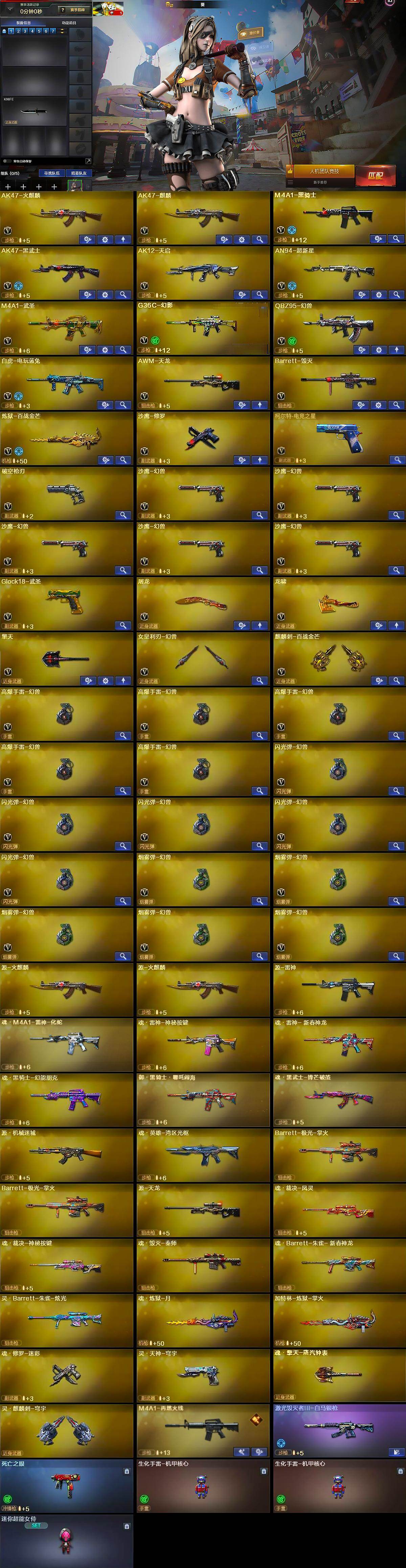 【英雄级武器】:AK47-火麒麟,AK47-麒麟,M4A1-黑骑士,AK47-黑武士,AK12-天启,AN94-超新星,M4A1-武圣,G36C-幻影,QBZ95-幻兽,白虎-电玩蓝兔,AWM-天龙,Barrett-毁灭,炼狱-百战金芒,沙鹰-修罗,柯尔特-电竞之星,破空枪刃,沙鹰-幻兽*5,Glock18-武圣,屠龙,龙啸,擎天,女皇利刃-幻兽,麒麟刺-百战金芒,高爆手雷-幻兽*5,闪光弹-幻兽*5,烟雾弹-幻兽*5